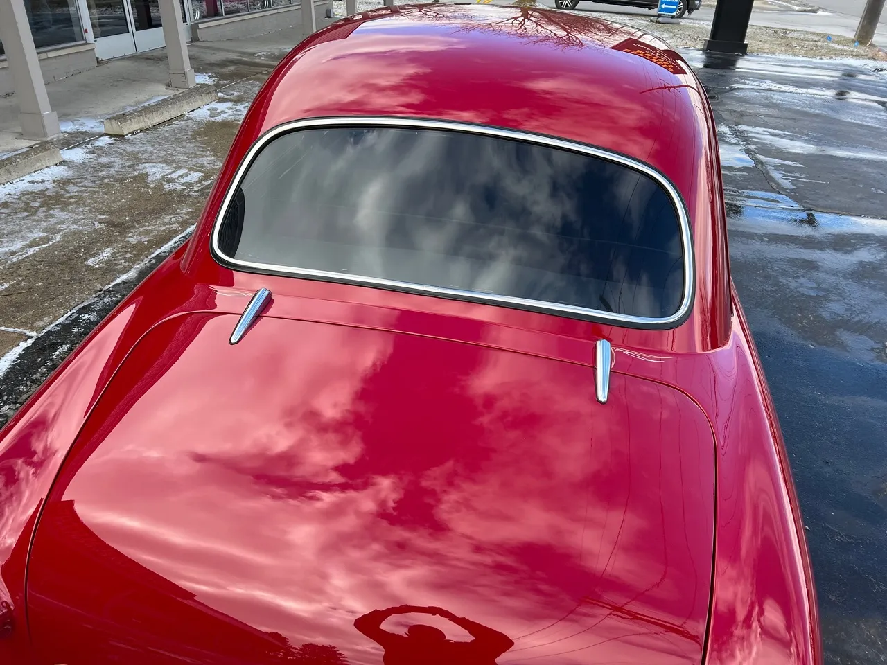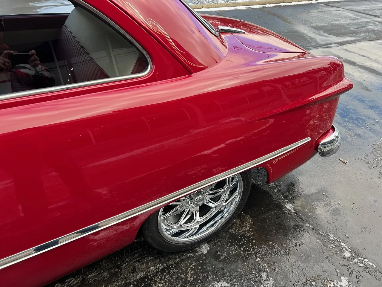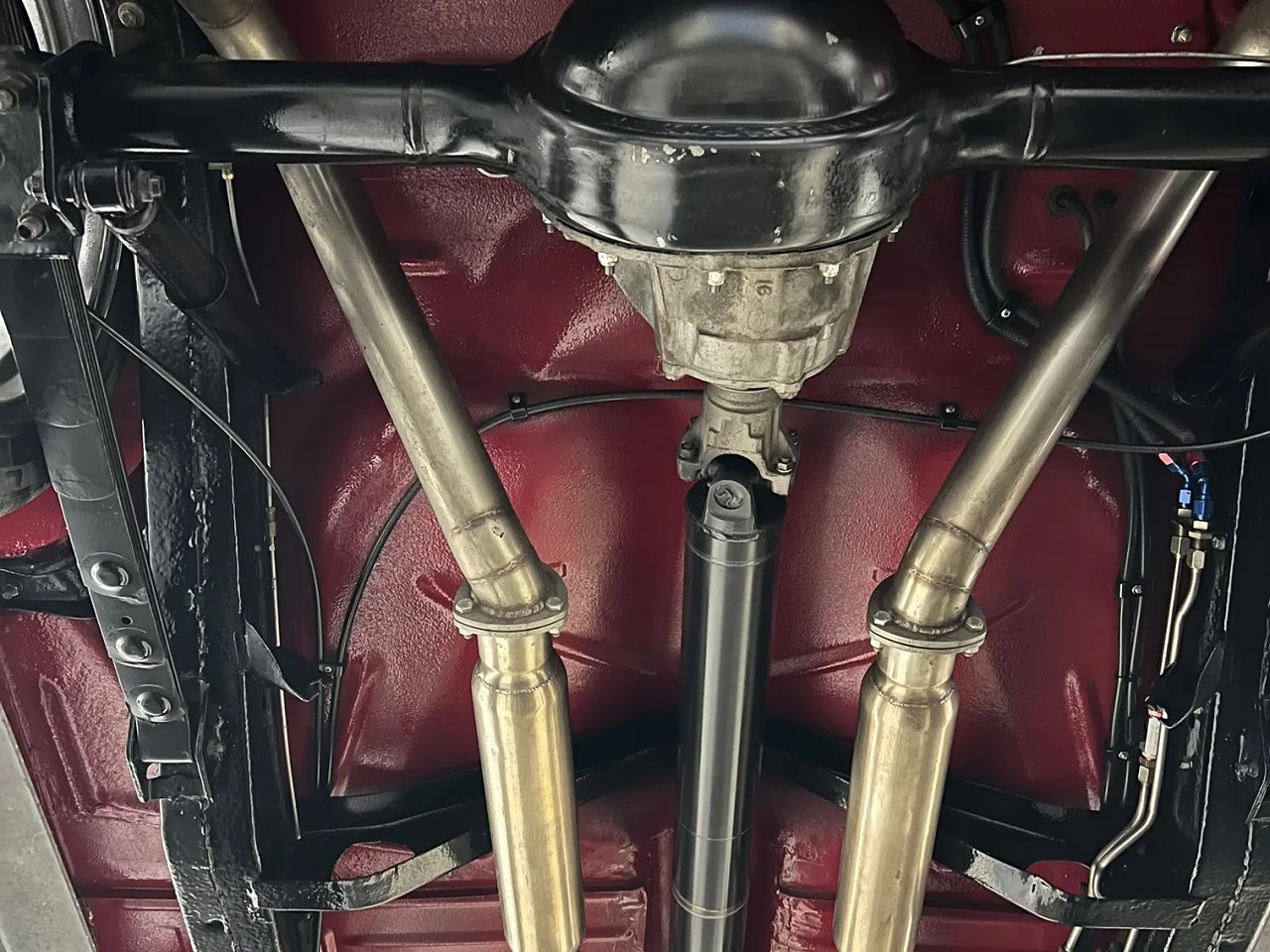 6400 miles on Professional No-Expense-Spare Rotisserie Restoration, stunning Garnet red paint, custom two-tone leather interior, GM Ram Jet 350 ci EFI engine, aluminum intake, ceramic headers, aluminum heads, custom engine covers, power steering, power brakes, Vintage air conditioning, front drop spindles, aluminum radiator with flex fan, 700R4 automatic overdrive transmission, bench seat, chrome tilt column with Lecara steering wheel, Lokar shifter, custom Autometer gauge cluster, am-fm radio, custom tig welded stainless dual exhaust with Smitty’s muffler & chrome tips, exhaust cut-outs, 9” Ford rear end, 245/40ZR18 Uniroyal tires, 205/50ZR17 fronts, 17 & 18” chrome US Mag wheels, finished trunk area, all new wiring harness, custom fuel tank, all new glass, custom front visor, frenched headlight & tail lights, Show Quality!IN STOCK