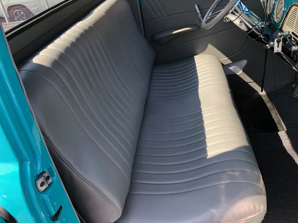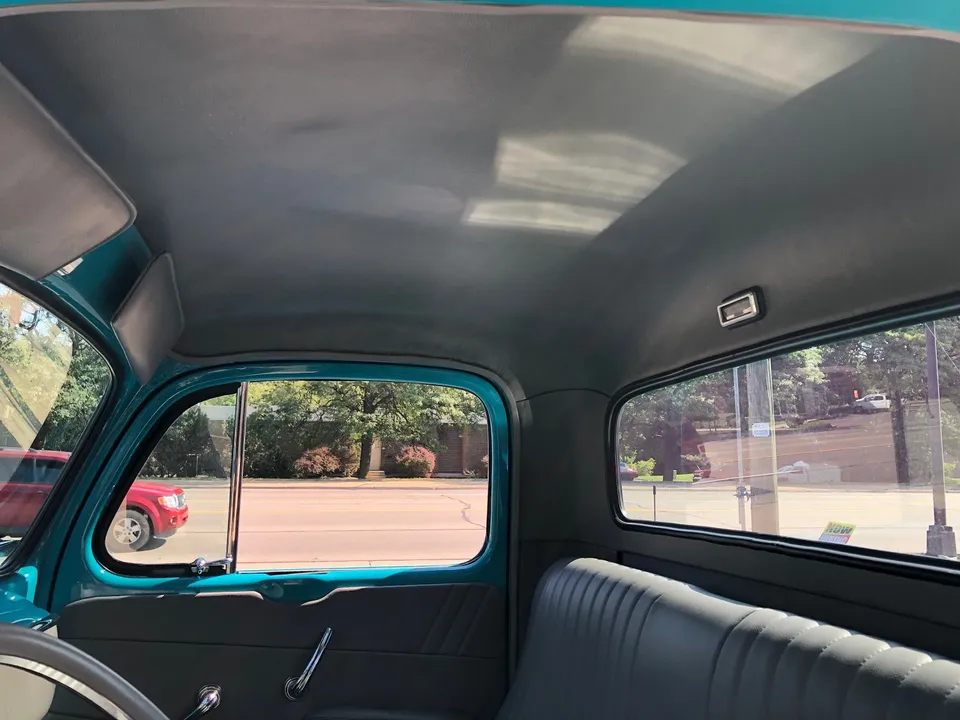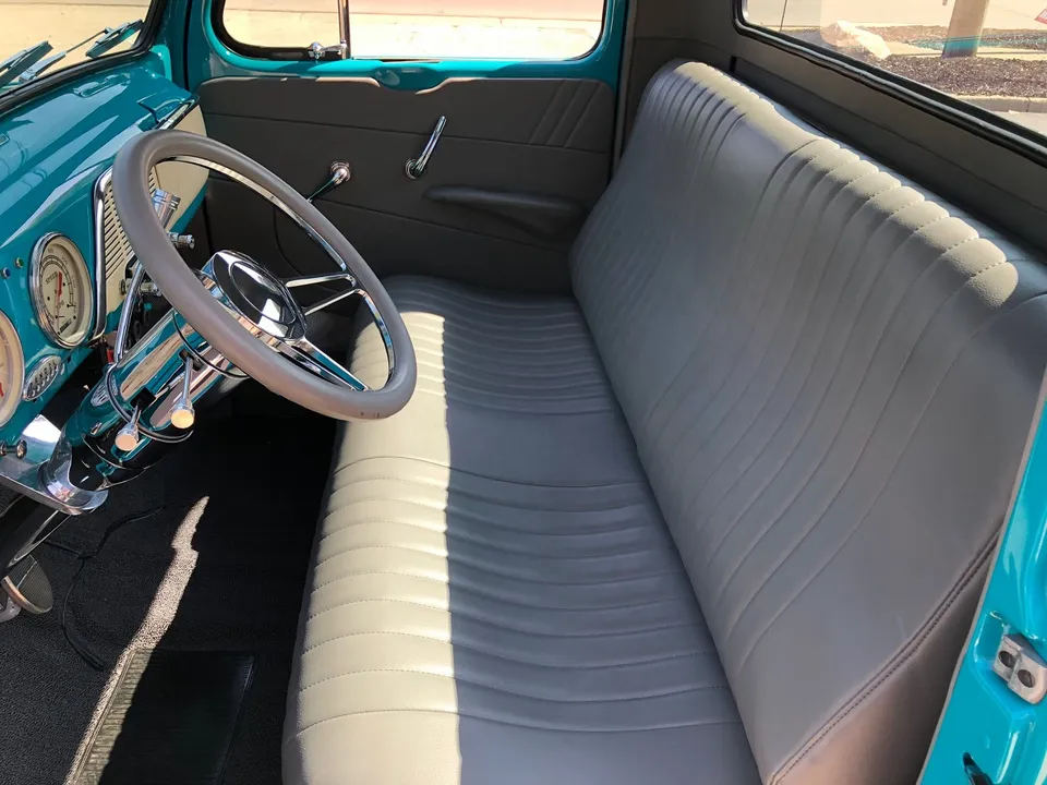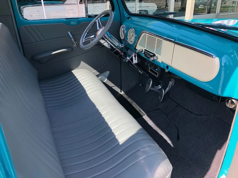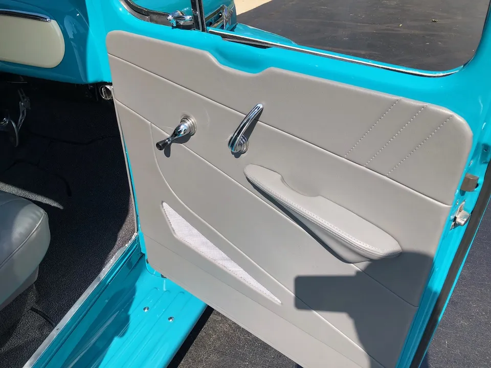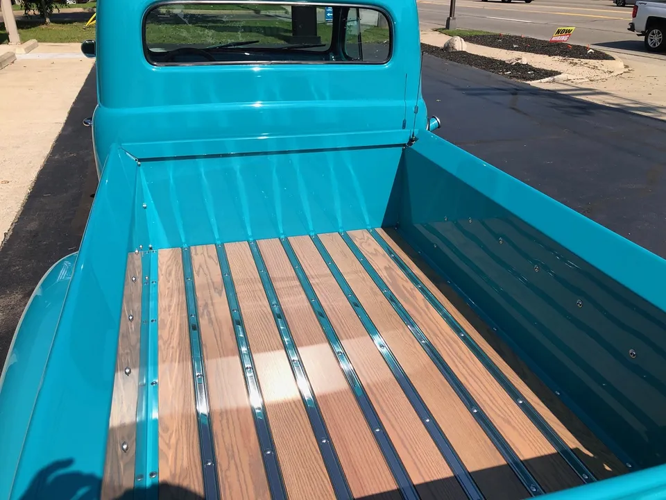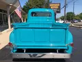 Clean North Carolina truck, Complete Custom Frame Off Build, beautiful Terrace blue, all new grey custom leather interior, 350 ci engine, Edelbrock 4 bbl, polished intake, finned aluminum air cleaner & valve covers, Saunders ceramic headers, Volare Independent Front Suspension, power steering, power front disc brakes, Vintage air conditioning, aluminum radiator, 350 turbodhydramatic transmission, bench seat, Ididit polished tilt column with billet wheel, Classic Instruments gauge cluster, Retrosounds radio, H pipe Flowmaster dual exhaust, leaf spring 9” rear end, 255/45R18 BF Goodrich Touring TA rear tires, 205/50ZR17 fronts, 17 & 18” chrome American Racing wheels, new wood bed, Ready to Cruise!IN STOCK