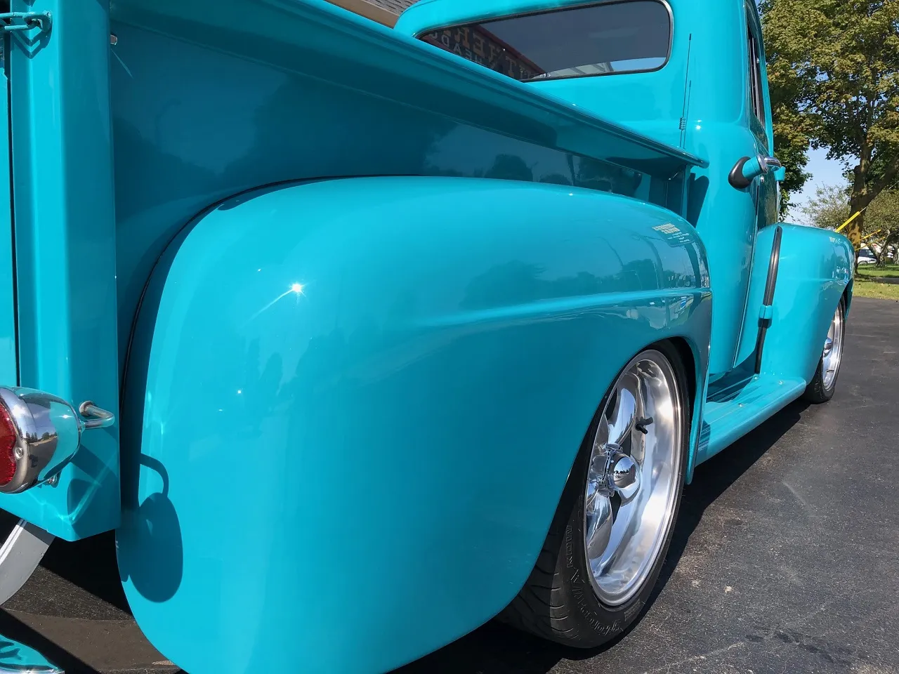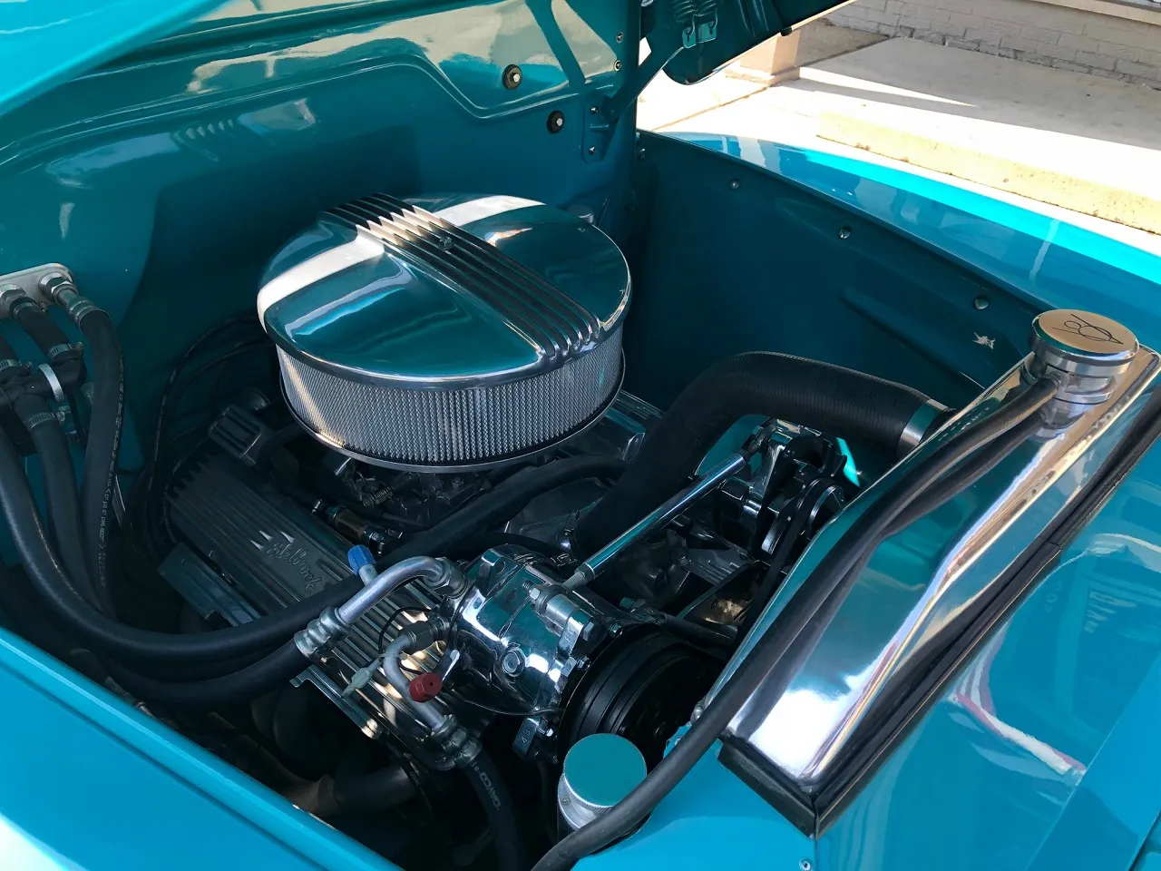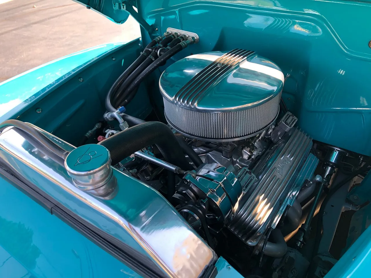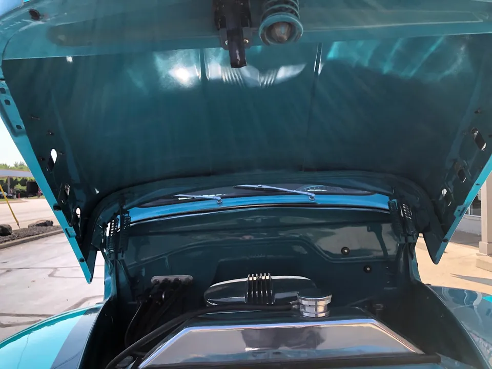 Clean North Carolina truck, Complete Custom Frame Off Build, beautiful Terrace blue, all new grey custom leather interior, 350 ci engine, Edelbrock 4 bbl, polished intake, finned aluminum air cleaner & valve covers, Saunders ceramic headers, Volare Independent Front Suspension, power steering, power front disc brakes, Vintage air conditioning, aluminum radiator, 350 turbodhydramatic transmission, bench seat, Ididit polished tilt column with billet wheel, Classic Instruments gauge cluster, Retrosounds radio, H pipe Flowmaster dual exhaust, leaf spring 9” rear end, 255/45R18 BF Goodrich Touring TA rear tires, 205/50ZR17 fronts, 17 & 18” chrome American Racing wheels, new wood bed, Ready to Cruise!IN STOCK