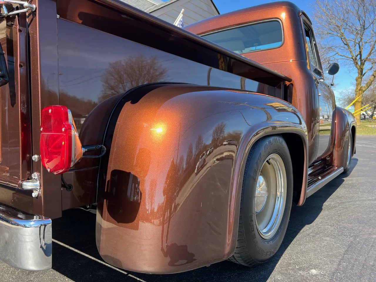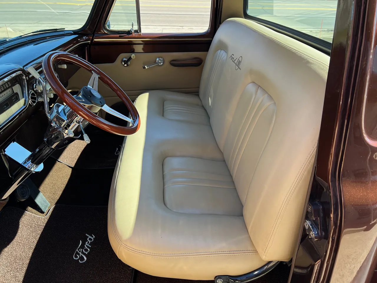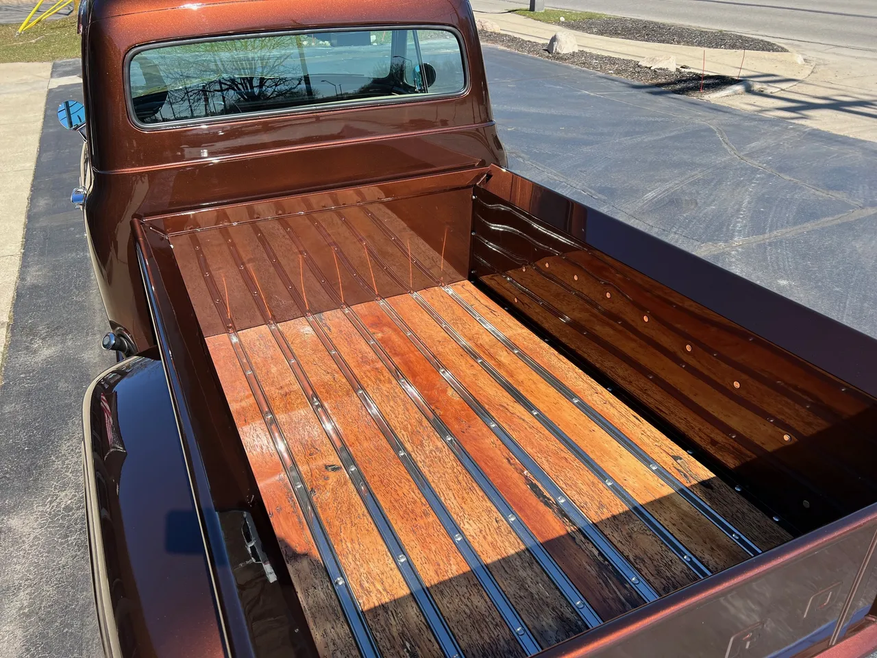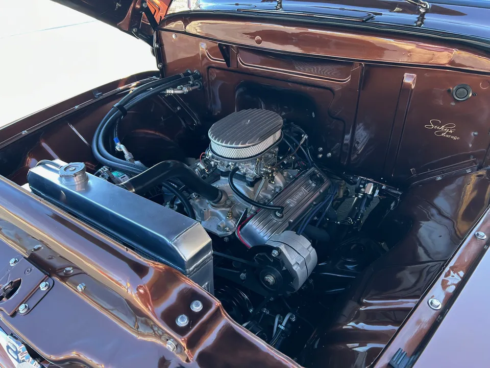 600 miles on Complete Frame-Off Restoration, stunning Root Beer metallic paint, plush tan leather interior, 350 ci engine, Edelbrock 650 cfm 4 bbl, Comp camshaft, Edelbrock aluminum intake, headers, HEI distributor, finned aluminum air cleaner & valve covers, Camaro front subframe with power steering, power front disc brakes, Vintage air conditioning, aluminum radiator with electric fan, 700R4 automatic overdrive transmission, bench seat, chrome tilt column with wood wheel, factory dash, Bosch gauges, Retrosounds radio, functional cowl, Flowmaster dual exhaust, 10 bolt 3.73 limited slip rear end, 275/60R15 rear tires, 235/60R15 fronts, 15” custom steel wheels with caps & rings (10”wide rears), custom Chestnut patina wood bed, new glass, dual chrome mirrors, Show Quality!