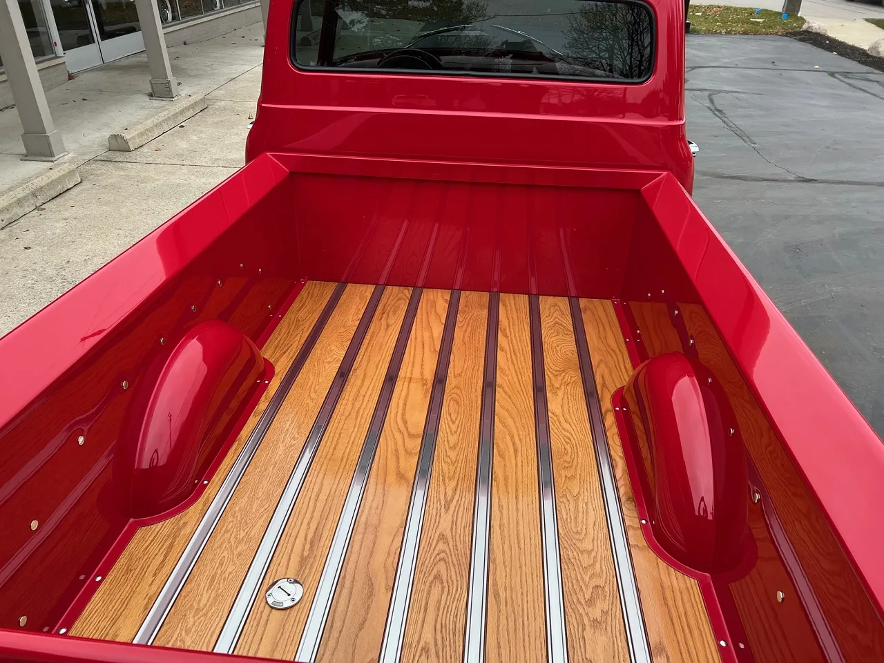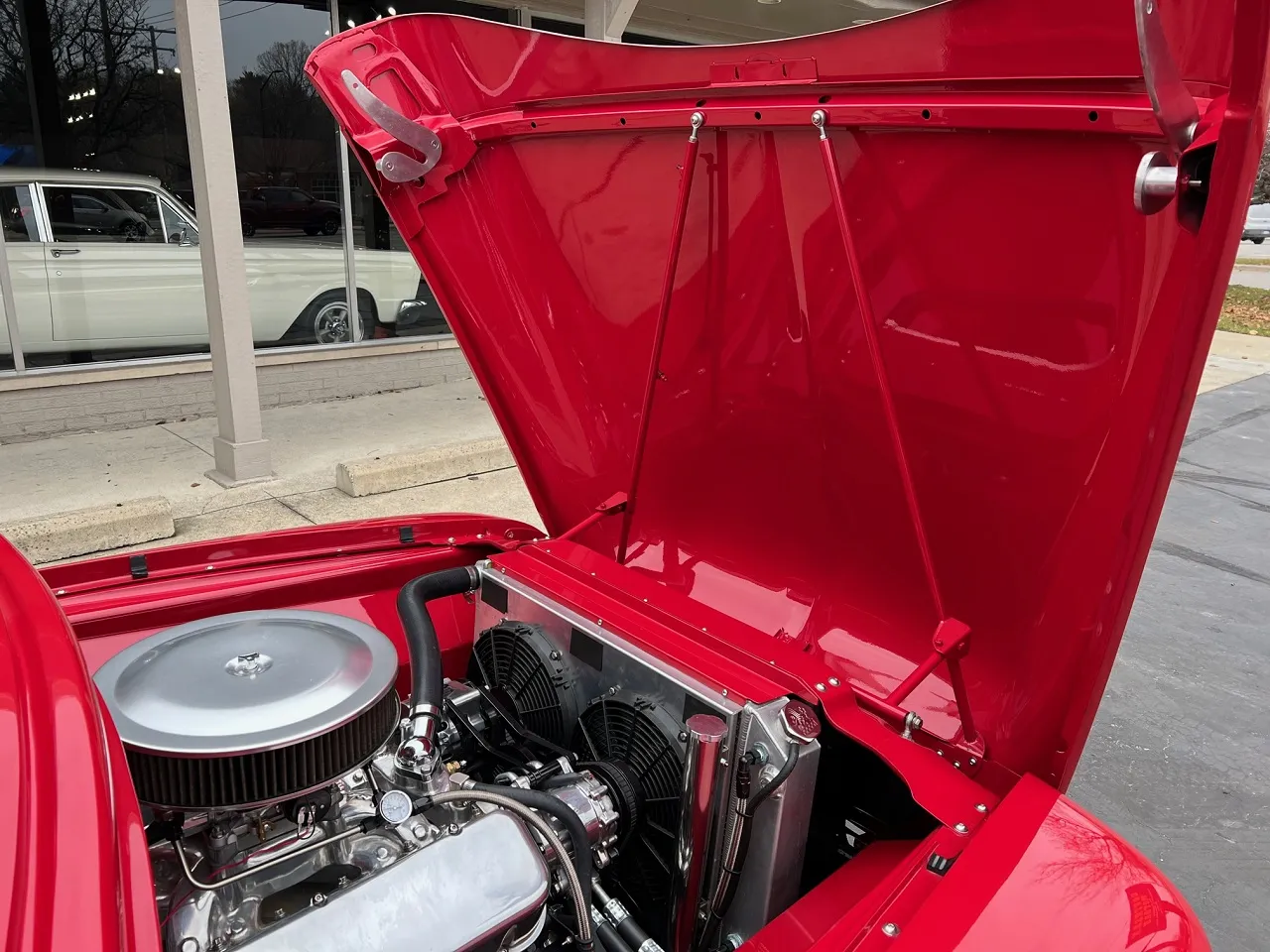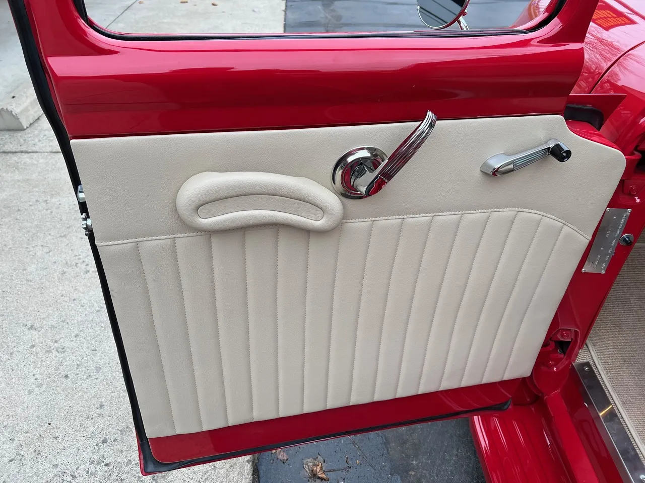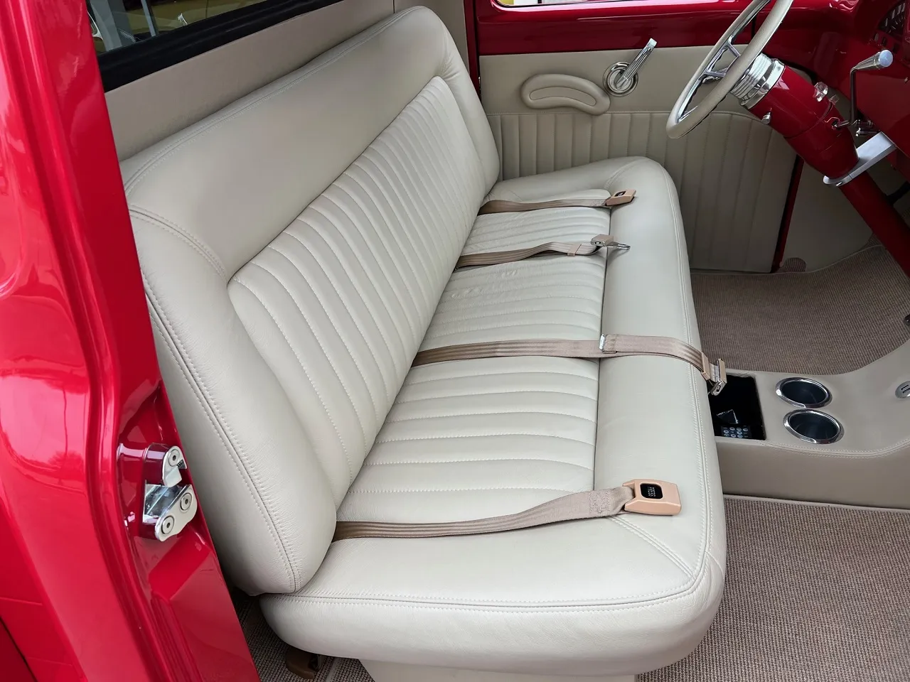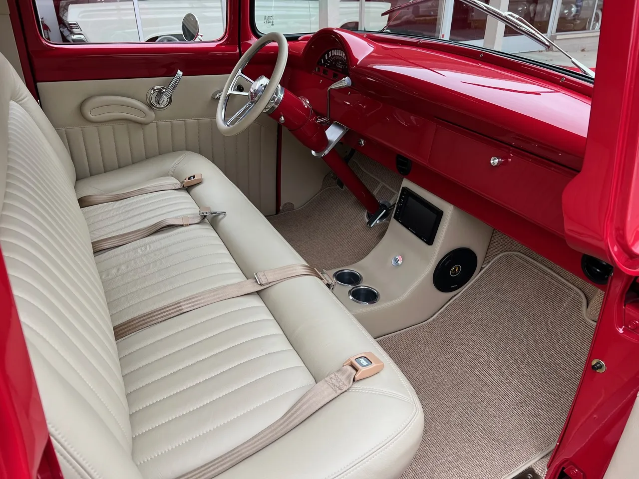 2100 miles on Complete Frame Off Restoration, All Steel, stunning Torch red paint, beautiful Katzkin vanilla leather interior, Merritt Brothers built 454 ci engine, Holley 670 cfm 4 bbl, Edelbrock RPM Air Gap aluminum intake, ceramic headers, billet air cleaner & valve covers, Fat Man Fabrications Mustang II tubular front suspension with power rack & pinion steering, power front disc brakes, Vintage air conditioning, Street Drive front runner system, Griffin aluminum radiator with dual electric fans, 400 turbohydramatic transmission, bench seat, tilt column with billet wheel, all new gauge cluster, Boss touchscreen sound system, custom console, German wool carpet, H pipe Flowmaster dual exhaust, John’s Industries 9” Ford 3.55 traction-lock rear end, 28X12R18LT Michey Thompson Sportsman rear tires, 245/40ZR18 fronts, 18” Billet Specialties wheels (10” wide rears), 19 gallon stainless fuel tank, all new glass with 1 piece side glass, Ron Francis wiring harness, Dynomat, No Limit tilt hood, Show Quality!IN STOCK