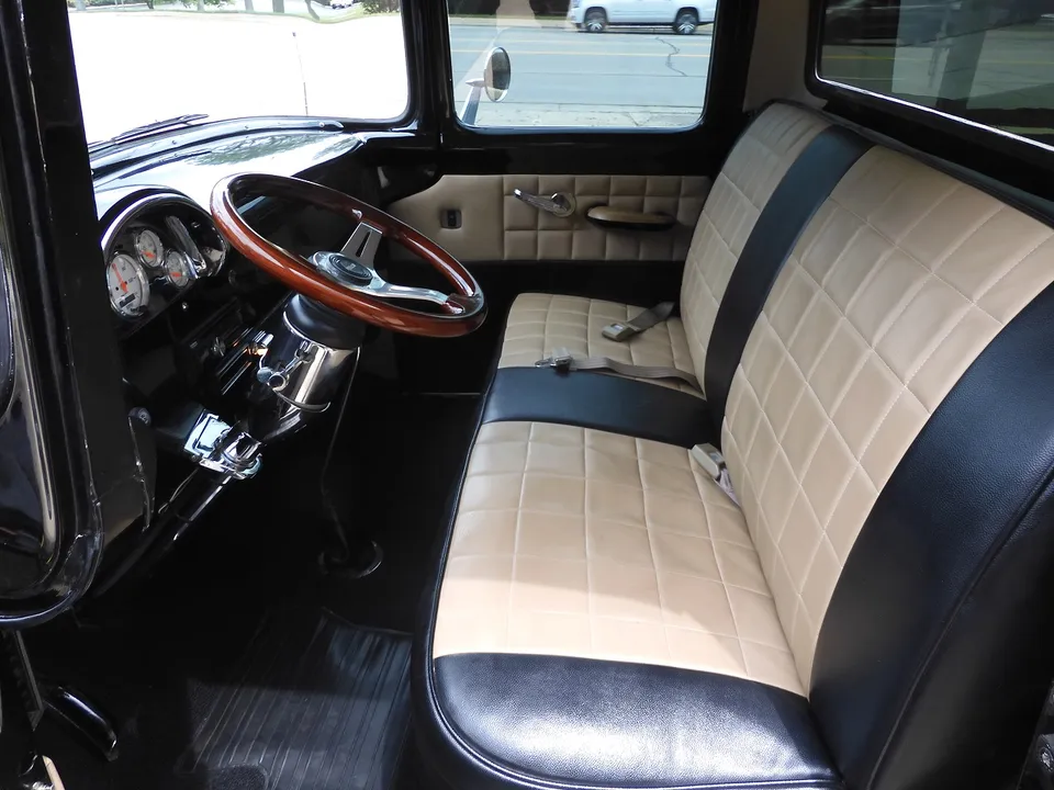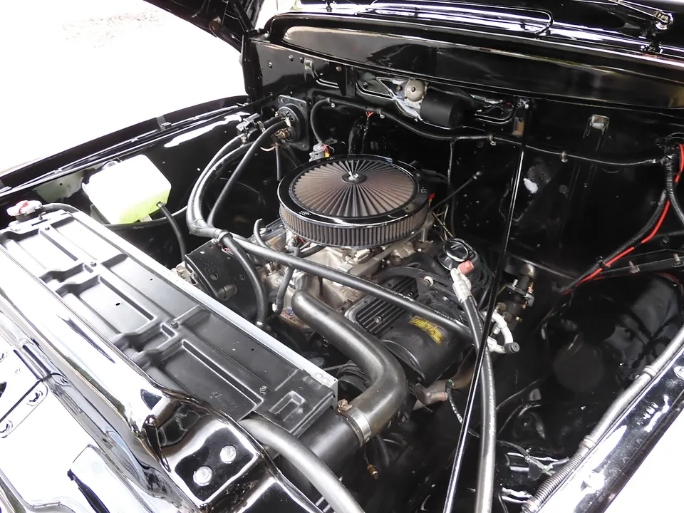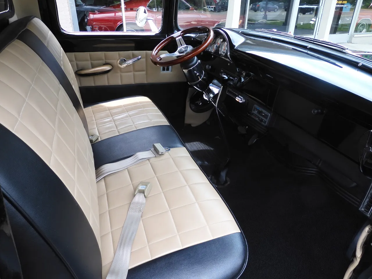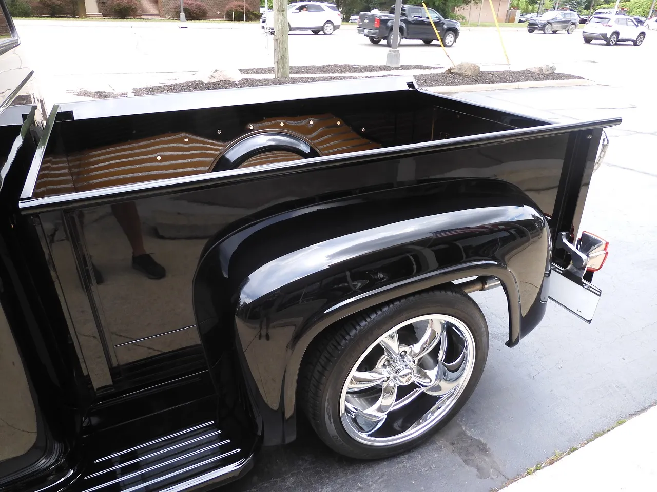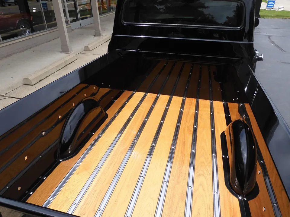 All Steel Georgia truck, beautiful Tuxedo black paint, custom two tone interior, Target Master 350 ci/330 hp crate engine, Edelbrock 4 bbl, Edelbrock Air Gap aluminum intake, aluminum heads, K&N filet top air cleaner, Edelbrock finned aluminum valve covers, MSD Pro Billet distributor, ceramic headers, power steering, power front disc brakes, PMT front drop axled with sway bar, air conditioning, aluminum radiator, bench seat, Ididit polished title column with wood wheel, Autometer gauge cluster, JVC sound system, Lokar shifter, power windows, H pipe Flowmaster dual exhaust with chrome tips, 10 bolt 3.23 rear end with Trick Flow billet cover, Air Lift wireless ride control system, 275/40R20 rear tires, 245/35ZR20 fronts, 20” chrome REV wheels, wood bed, Ready to Cruise!IN STOCK