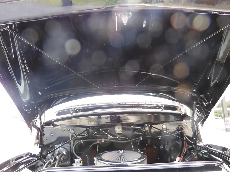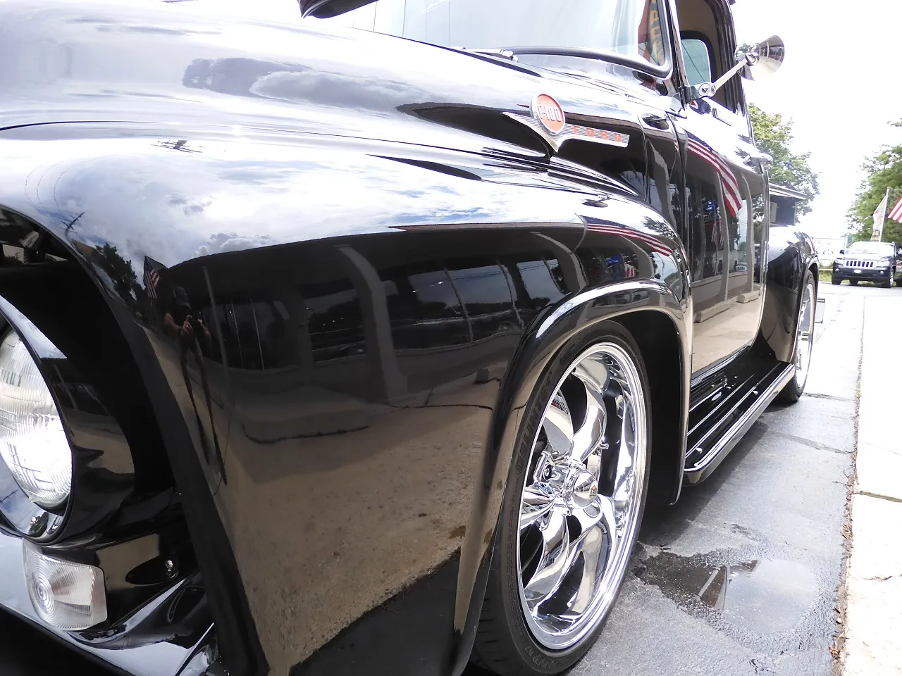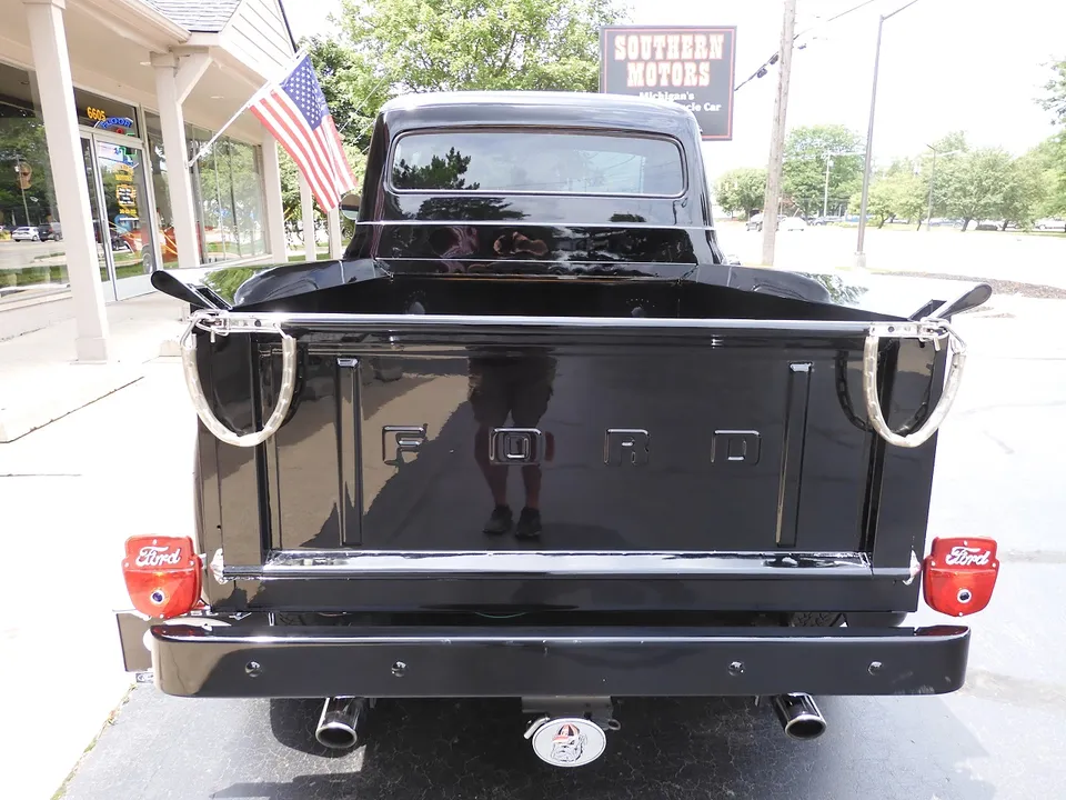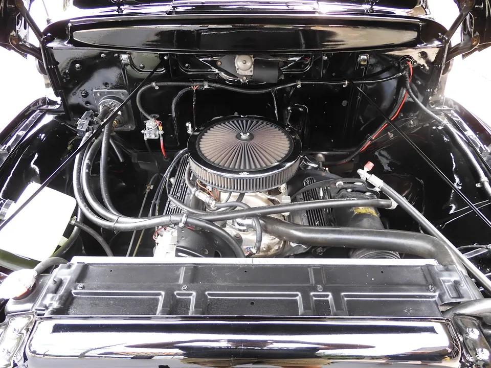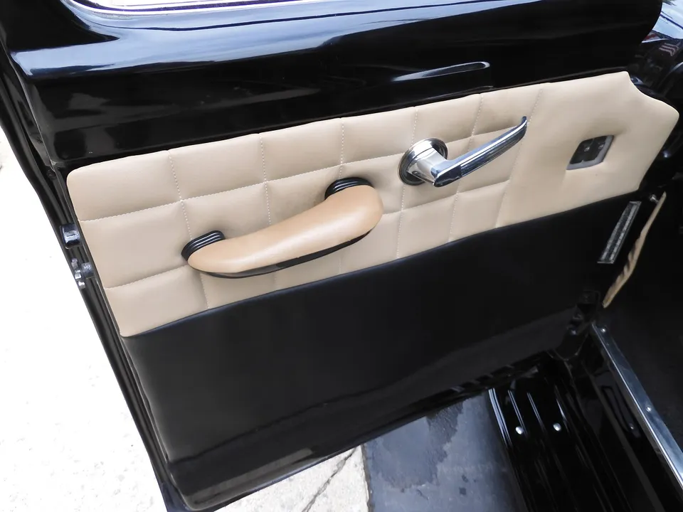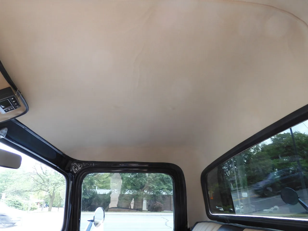 All Steel Georgia truck, beautiful Tuxedo black paint, custom two tone interior, Target Master 350 ci/330 hp crate engine, Edelbrock 4 bbl, Edelbrock Air Gap aluminum intake, aluminum heads, K&N filet top air cleaner, Edelbrock finned aluminum valve covers, MSD Pro Billet distributor, ceramic headers, power steering, power front disc brakes, PMT front drop axled with sway bar, air conditioning, aluminum radiator, bench seat, Ididit polished title column with wood wheel, Autometer gauge cluster, JVC sound system, Lokar shifter, power windows, H pipe Flowmaster dual exhaust with chrome tips, 10 bolt 3.23 rear end with Trick Flow billet cover, Air Lift wireless ride control system, 275/40R20 rear tires, 245/35ZR20 fronts, 20” chrome REV wheels, wood bed, Ready to Cruise!IN STOCK