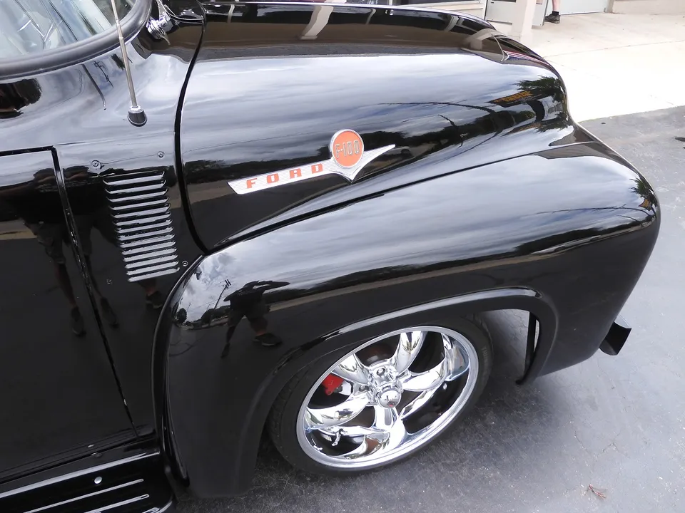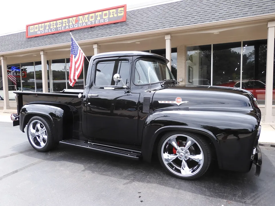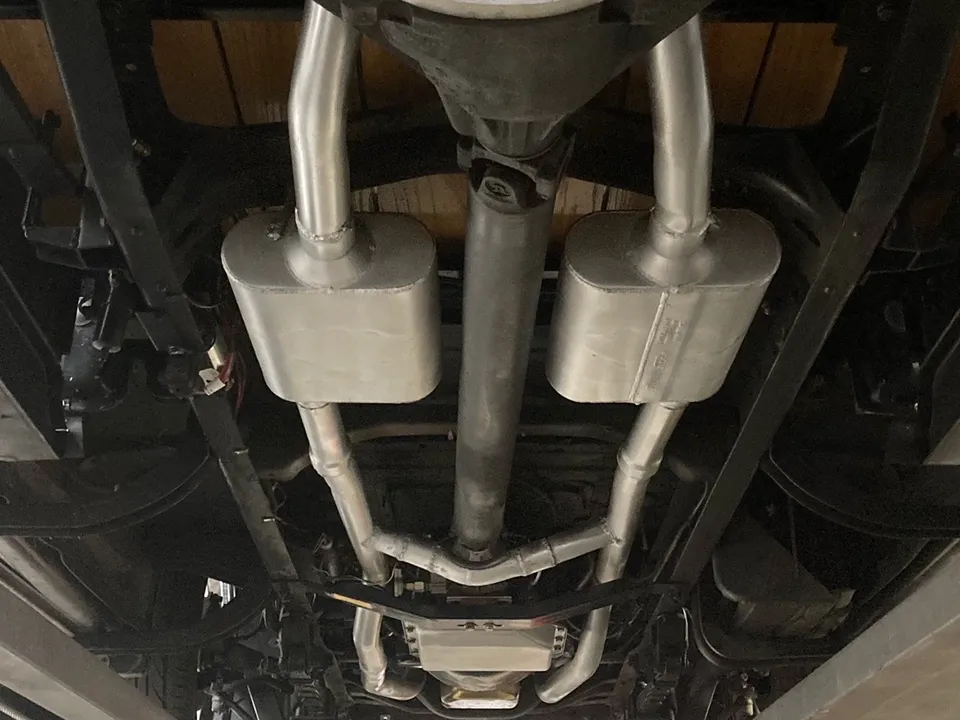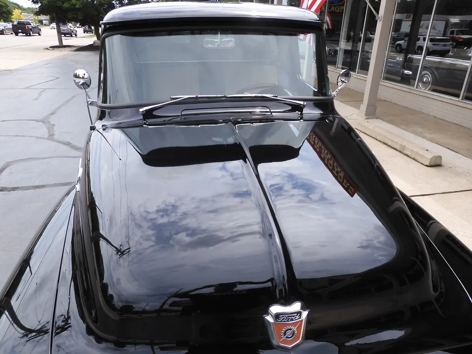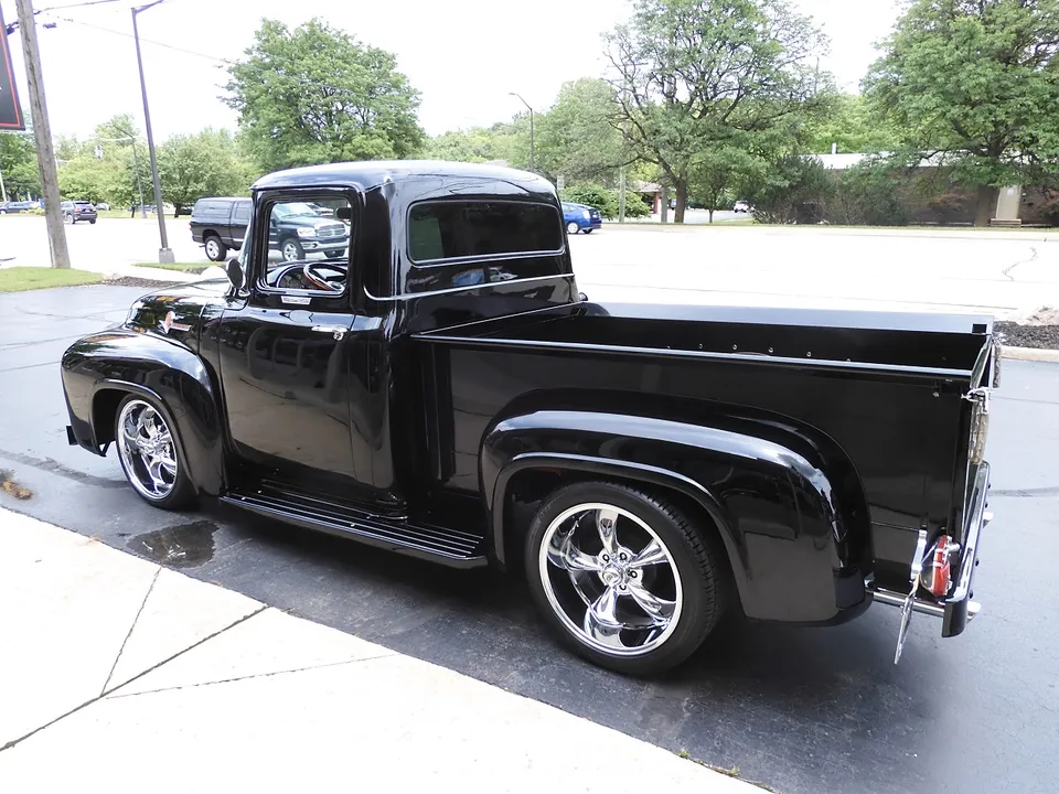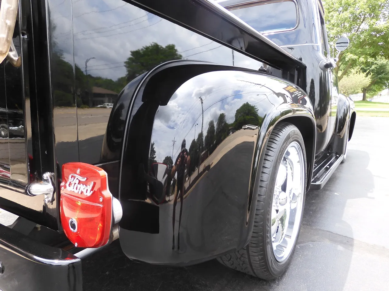 All Steel Georgia truck, beautiful Tuxedo black paint, custom two tone interior, Target Master 350 ci/330 hp crate engine, Edelbrock 4 bbl, Edelbrock Air Gap aluminum intake, aluminum heads, K&N filet top air cleaner, Edelbrock finned aluminum valve covers, MSD Pro Billet distributor, ceramic headers, power steering, power front disc brakes, PMT front drop axled with sway bar, air conditioning, aluminum radiator, bench seat, Ididit polished title column with wood wheel, Autometer gauge cluster, JVC sound system, Lokar shifter, power windows, H pipe Flowmaster dual exhaust with chrome tips, 10 bolt 3.23 rear end with Trick Flow billet cover, Air Lift wireless ride control system, 275/40R20 rear tires, 245/35ZR20 fronts, 20” chrome REV wheels, wood bed, Ready to Cruise!IN STOCK