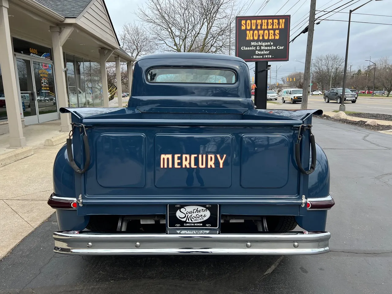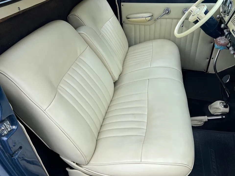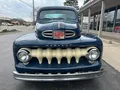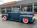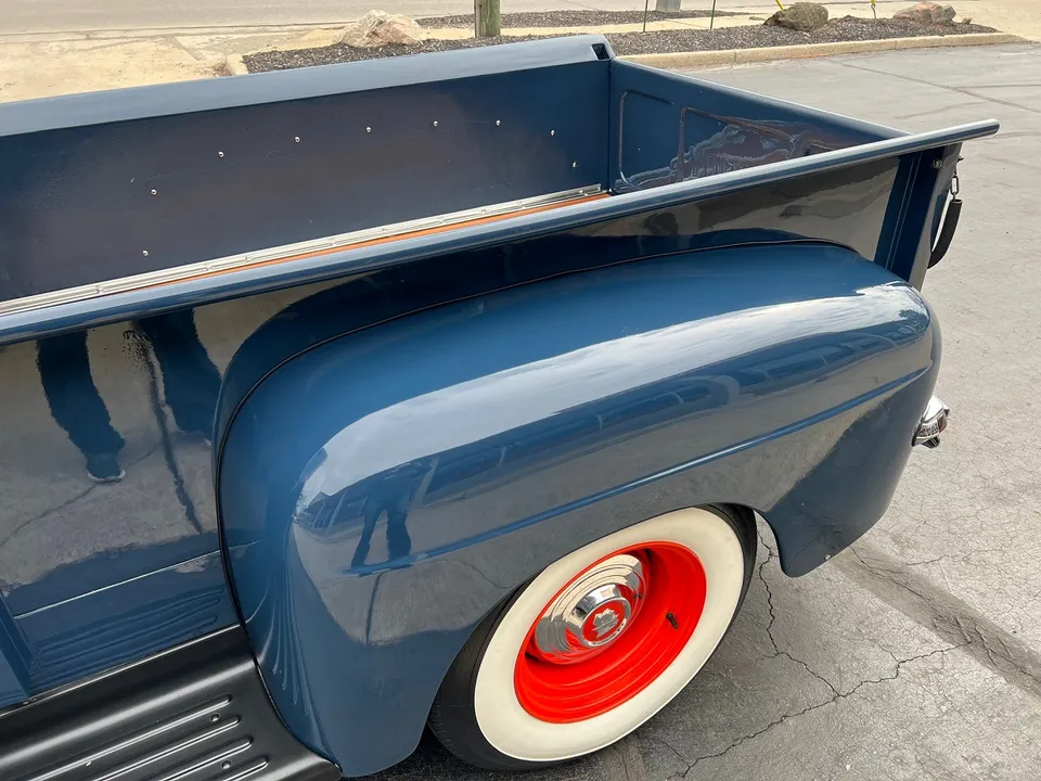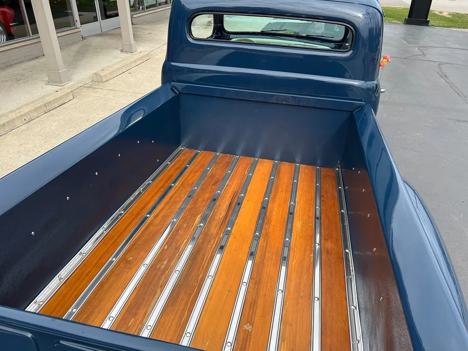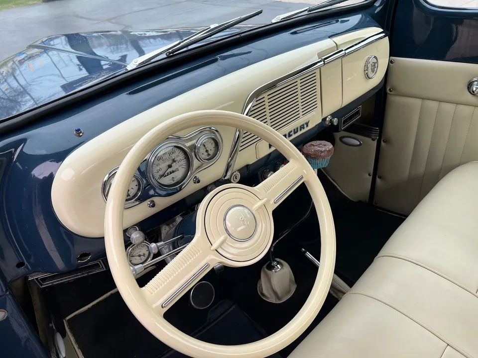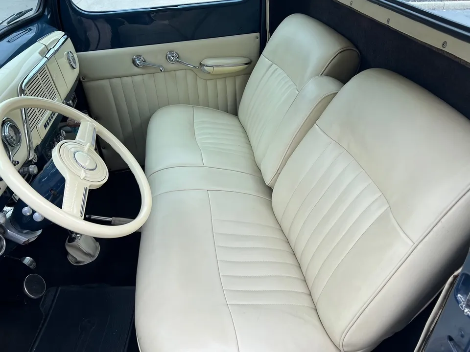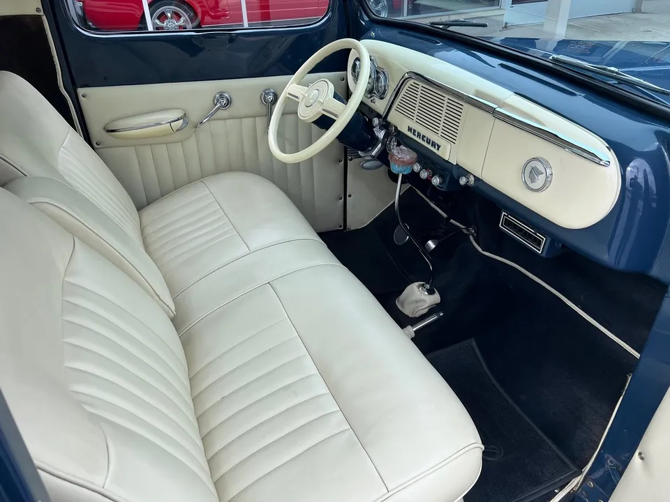 Rare Mercury M1, Clean Florida truck, Admiral blue paint, white custom vinyl interior, 350 ci engine, Edelbrock 4 bbl, Edelbrock aluminum intake, headers, chrome air cleaner & Corvette finned aluminum valve covers, HEI distributor, Mustang II front suspension with power rack & pinion steering, power front disc brakes, air conditioning, 350 turbohyramatic transmission, bench seat, tilt column with Lokar wheel & 36’ horn button, Stewart Warner gauge cluster, Lokar shifter, new Flowmaster dual exhaust, 9” Ford rear end, custom fuel tank, 235/75R15 Coker Classic wide white wall rear tires, 205/70R15 fronts, 15” steel wheels with Merc caps, Cypress wood bed, 3” Chop, 55’ Buick headlight rings, Custom grill, 49 Merc tail lights, Magazine Feature Truck!IN STOCK