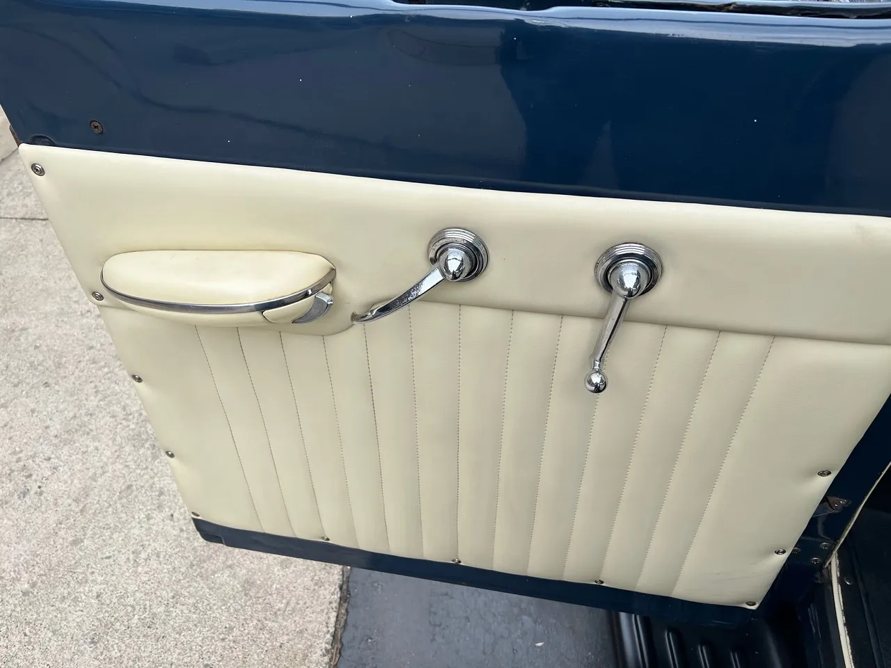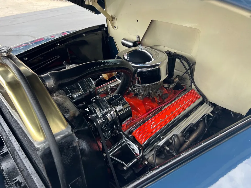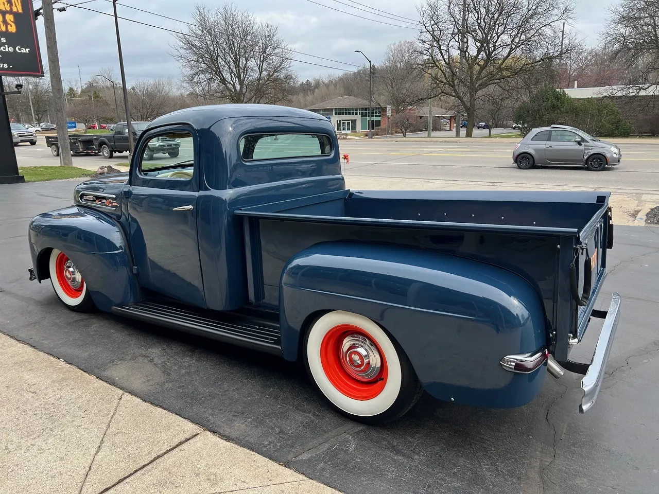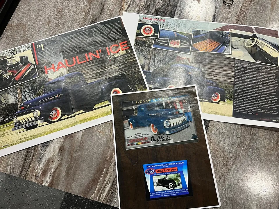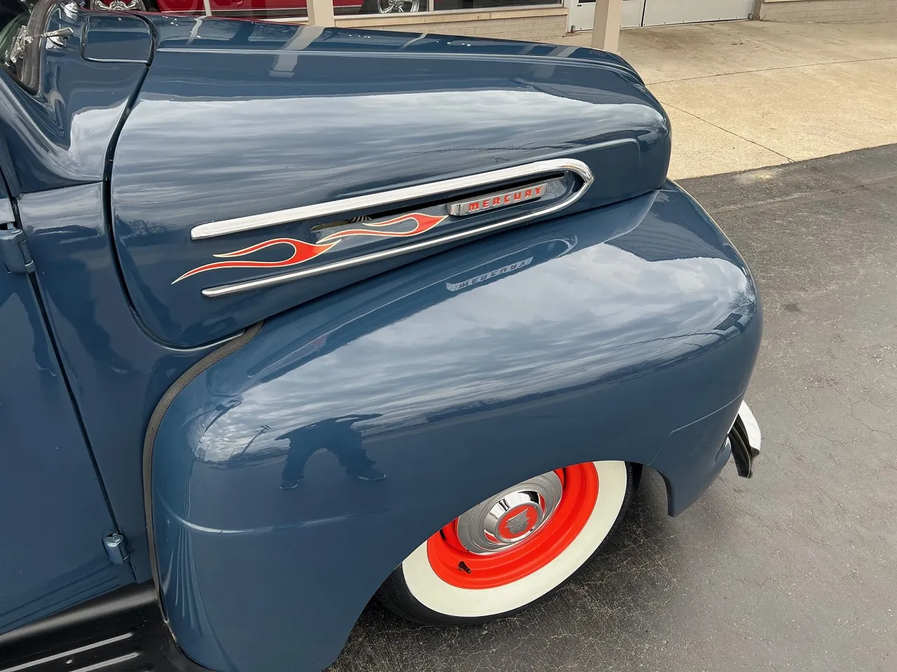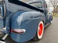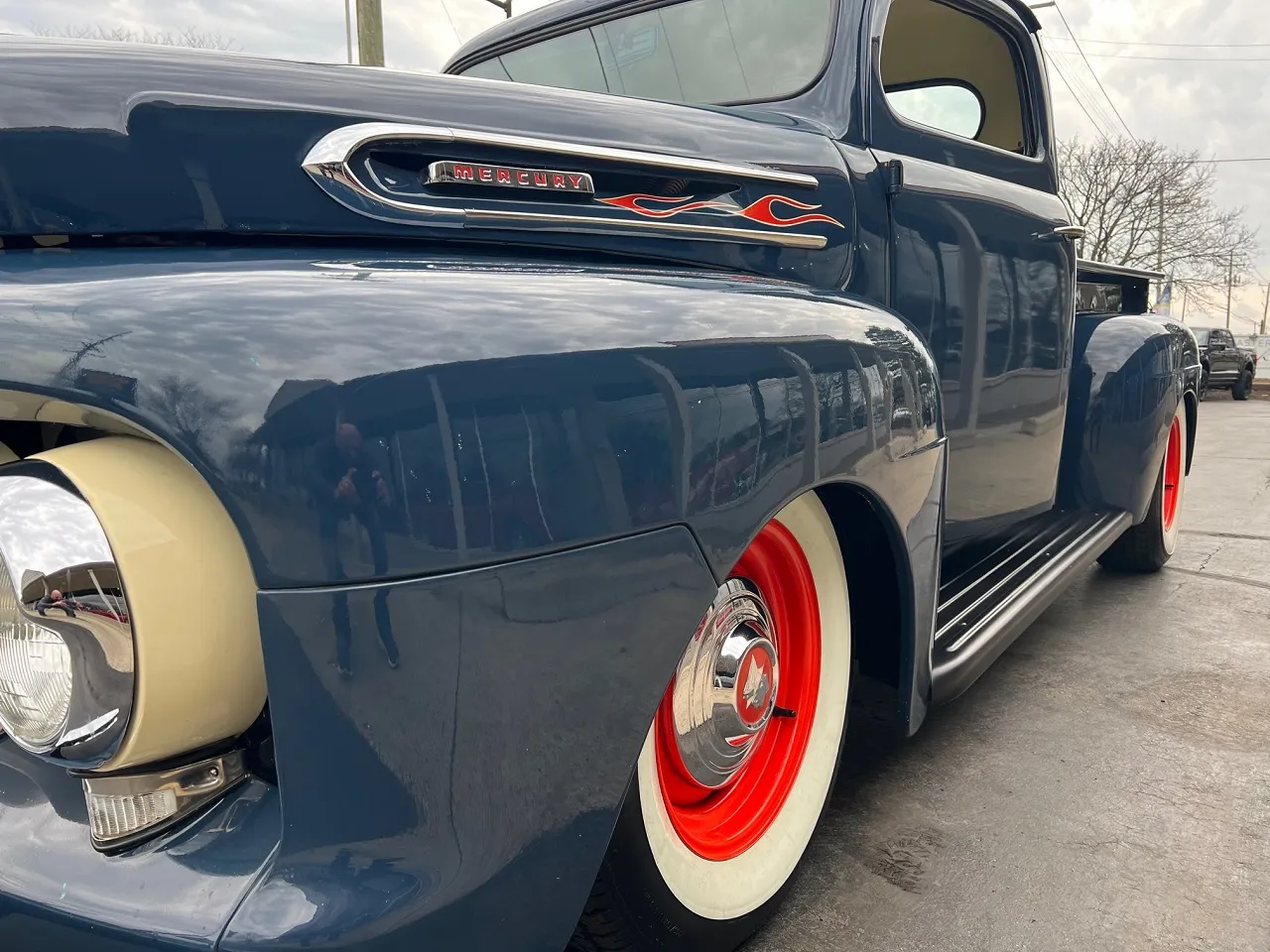 Rare Mercury M1, Clean Florida truck, Admiral blue paint, white custom vinyl interior, 350 ci engine, Edelbrock 4 bbl, Edelbrock aluminum intake, headers, chrome air cleaner & Corvette finned aluminum valve covers, HEI distributor, Mustang II front suspension with power rack & pinion steering, power front disc brakes, air conditioning, 350 turbohyramatic transmission, bench seat, tilt column with Lokar wheel & 36’ horn button, Stewart Warner gauge cluster, Lokar shifter, new Flowmaster dual exhaust, 9” Ford rear end, custom fuel tank, 235/75R15 Coker Classic wide white wall rear tires, 205/70R15 fronts, 15” steel wheels with Merc caps, Cypress wood bed, 3” Chop, 55’ Buick headlight rings, Custom grill, 49 Merc tail lights, Magazine Feature Truck!IN STOCK