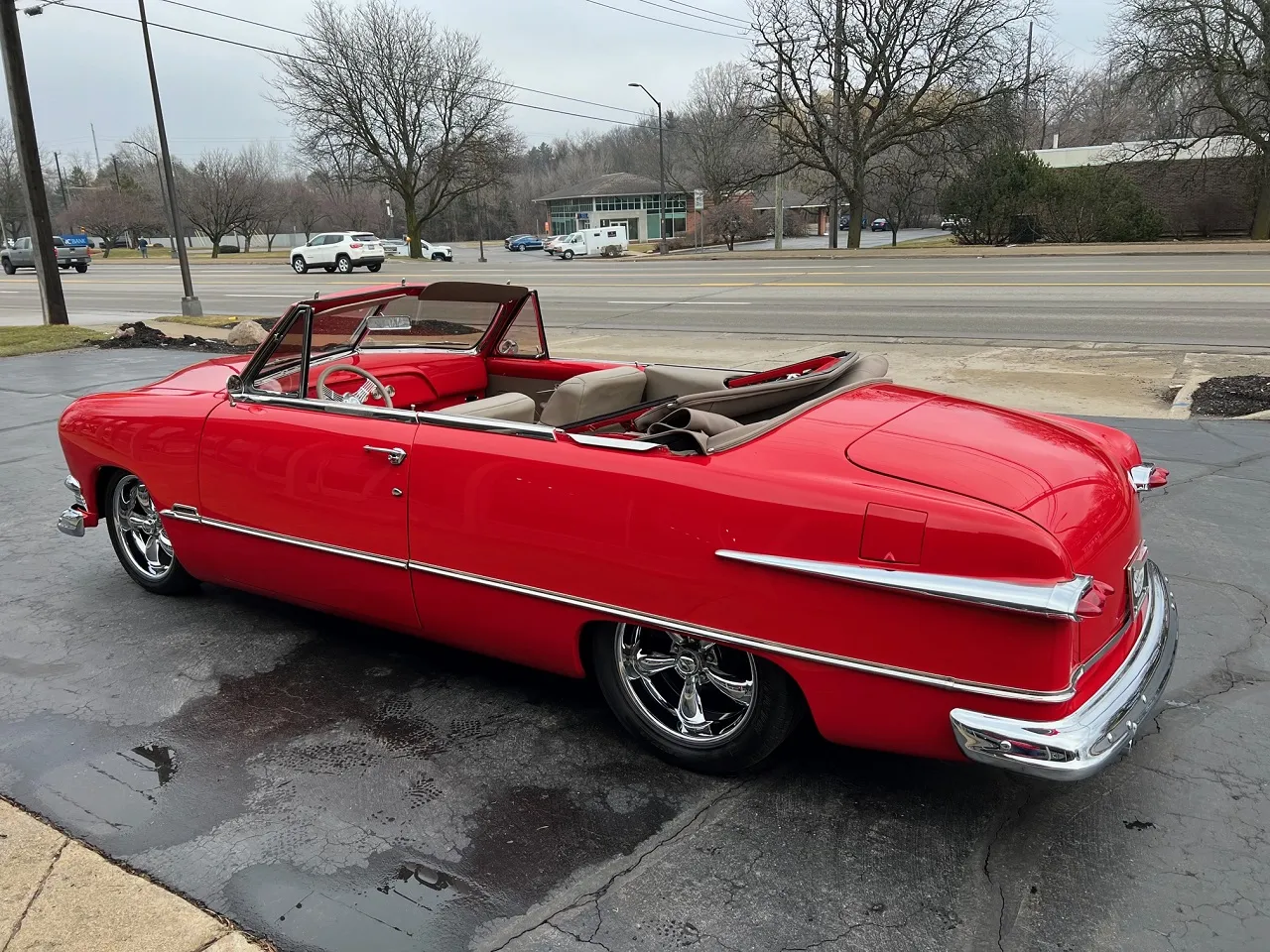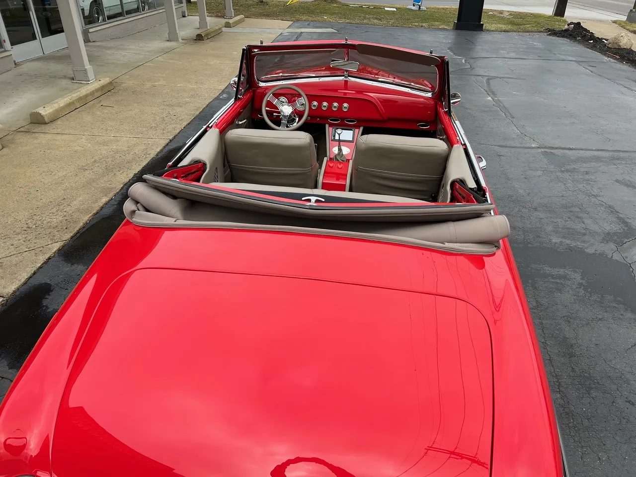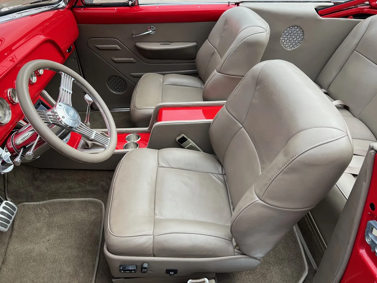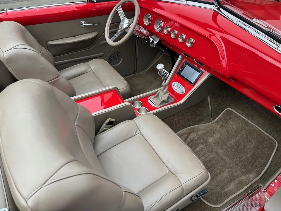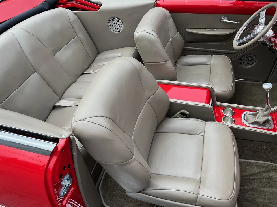 4,000 on Complete Frame-Off Custom Built Restomod, clean Alabama car, beautiful Victory red paint, custom tan leather interior, tan canvas convertible top, 5.7 liter LS1 EFI engine, PSI controller, 4L60E automatic overdrive transmission, Spectre Performance cold air intake, ceramic coated headers, Mustang II front suspension with tubular upper & lower control arm with coil-over shocks, power rack & pinion steering, power front disc brakes, Vintage air conditioning, aluminum radiator with electric fan, power bucket seats, full length console with Lokar shifter, tilt column with Banjo steering wheel, Classic Instruments gauge cluster, custom sound system, power windows, power top, smoothed dash, LED lighting, Ron Francis wiring harness, dual exhaust with chrome tips, boxed frame, 10 bolt rear end with de-arched springs, sway bar, Ride Tech shocks, stainless fuel tank, 235/50R18 rear tires, 225/45R18 fronts, chrome 18” Coys C5 wheels, finished trunk, Show Quality!IN STOCK
