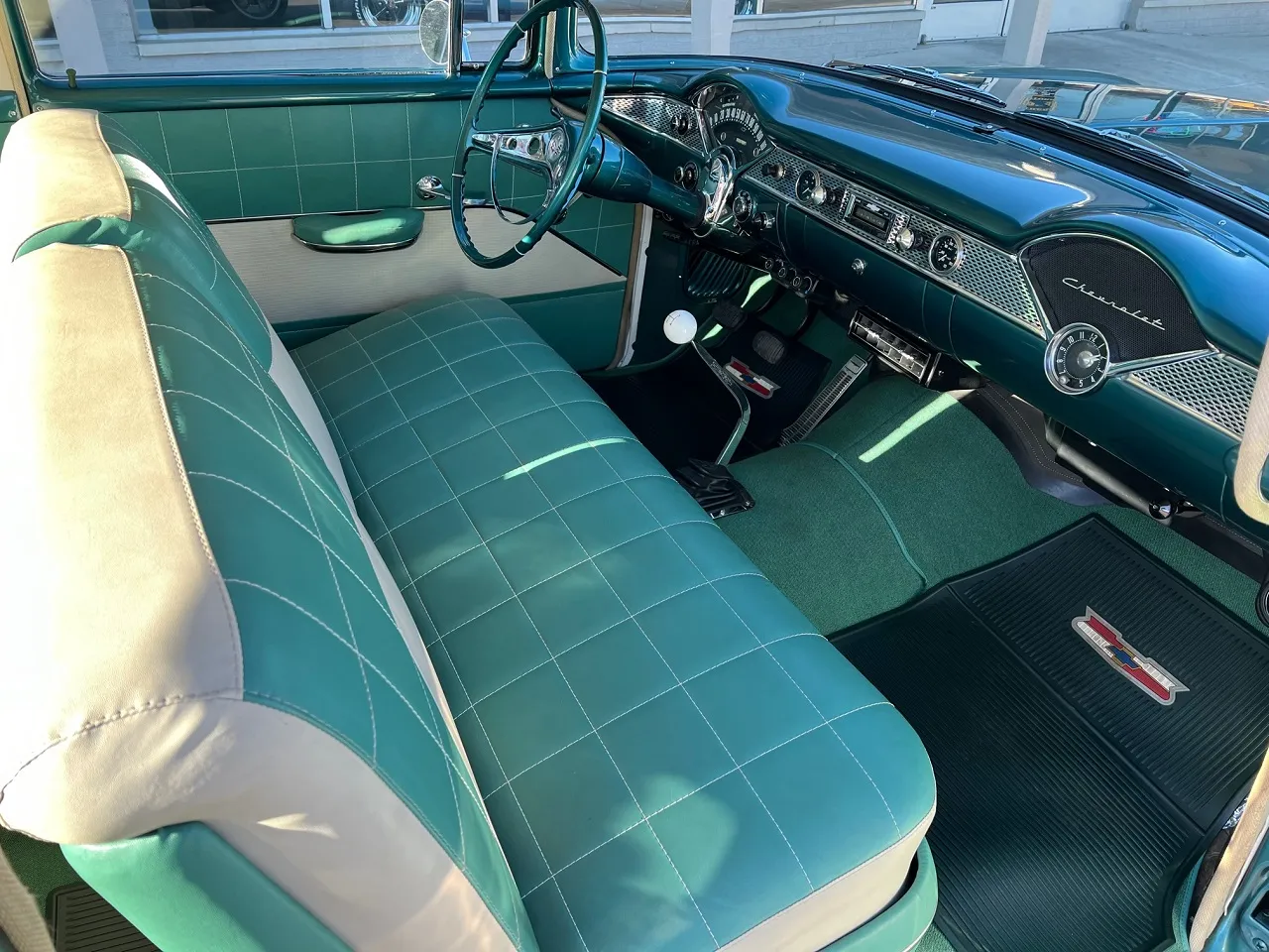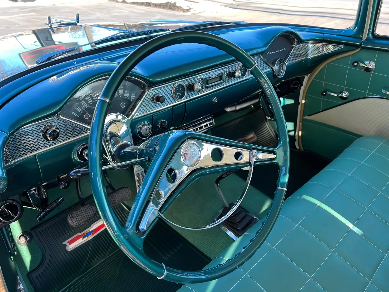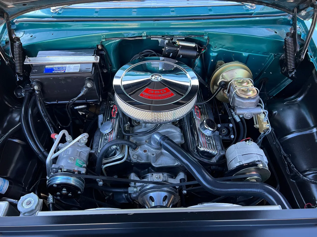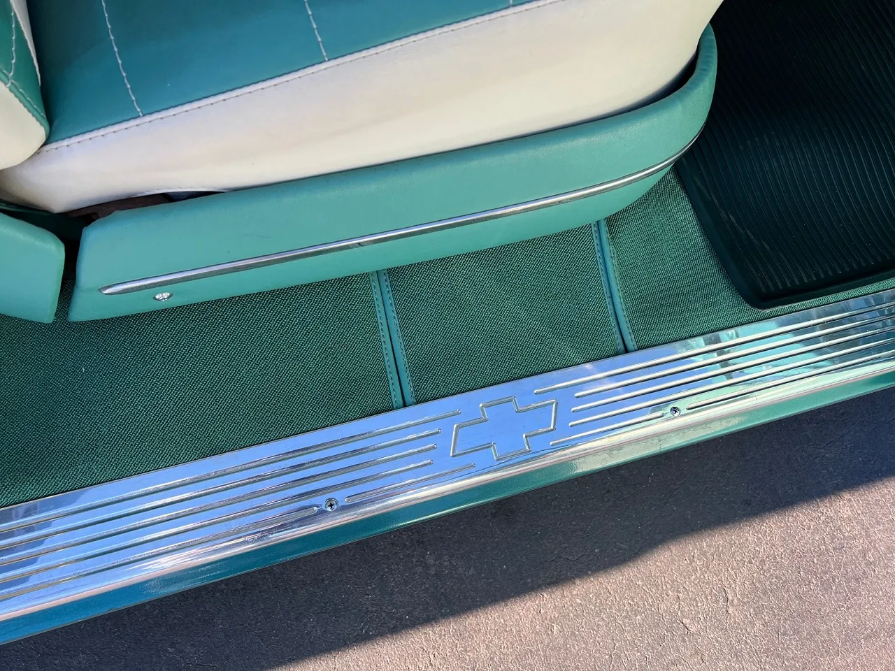 7300 miles on Complete Frame-Off Restoration, beautiful Neptune green metallic & Shoreline beige, matching two tone Del Ray interior, 350 ci GM crate engine, 4 speed manual transmission, Carter 4 bbl, GM aluminum intake, Ram’s horn exhaust manifolds, chrome air cleaner & valve covers, HEI distributor, power steering, power front disc brakes, Vintage heat & A/C, aluminum pulley’s, aluminum radiator with dual electric fans, Billstein adjustable coil over front shocks, factory bench seat, Hurst shifter, 59’ Impala steering wheel, factory dash, Retrosounds am-fm radio, Daytona carpet, new Flowmaster dual exhaust, GM 10 bolt 3.73 limited slip rear end with leaf springs, aluminum fuel tank, 245/40ZR20 rear tires, 225/45R18 fronts, 18 & 20” Coys C5 wheels, lowered 2”, shaded glass, LED tail lights, dual chrome mirrors, Ready to Cruise!