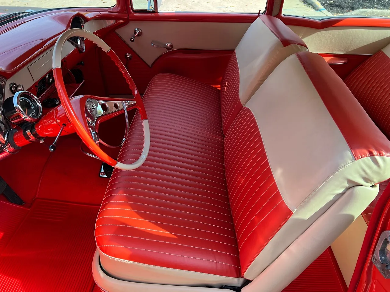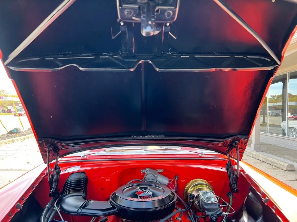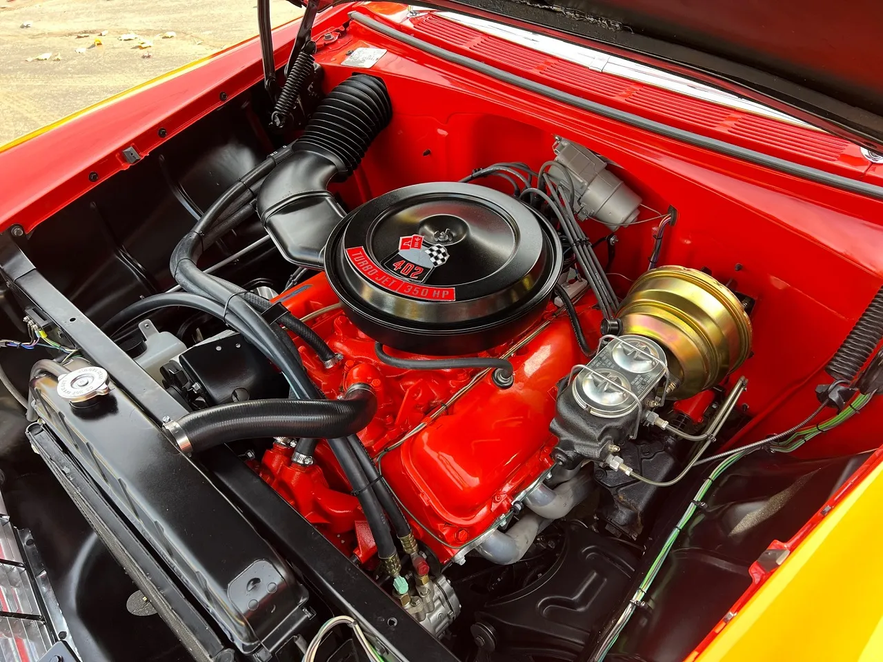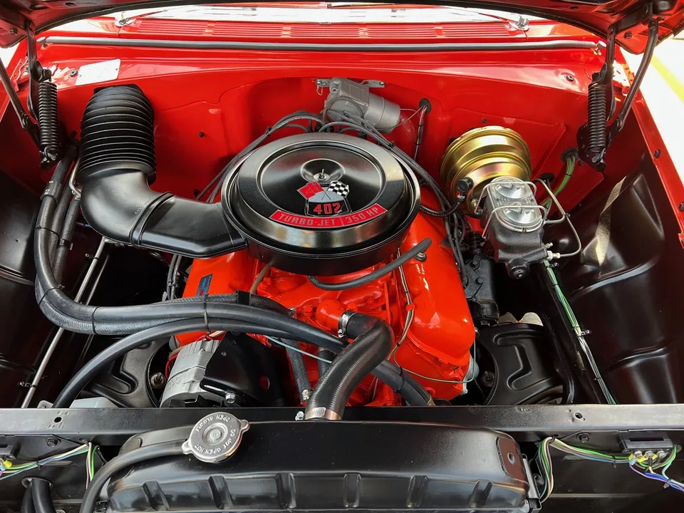 341 miles on Documented Frame Off Rotisserie Restoration, clean Alabama car, beautiful two tone Matador red & Adobe beige paint, two tone matching vinyl interior, 402 ci engine, 4 speed manual transmission, 4 bbl, factory intake manifolds, ceramic headers, power front disc brakes, Vintage air conditioning, factory bench seat, factory dash, Sun Pro tach & gauges, Retrosounds radio, stainless X pipe dual exhaust with electric cut-outs, factory rear end with 3.23 limited slip gear & POL traction bars, 275/40ZR20 rear tires, 235/40ZR18 fronts, 18 & 20” American Racing Torque Thrust II wheels, Collector Quality!