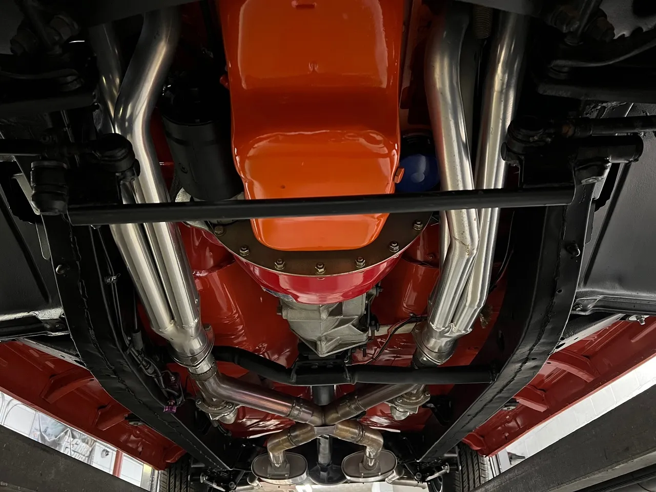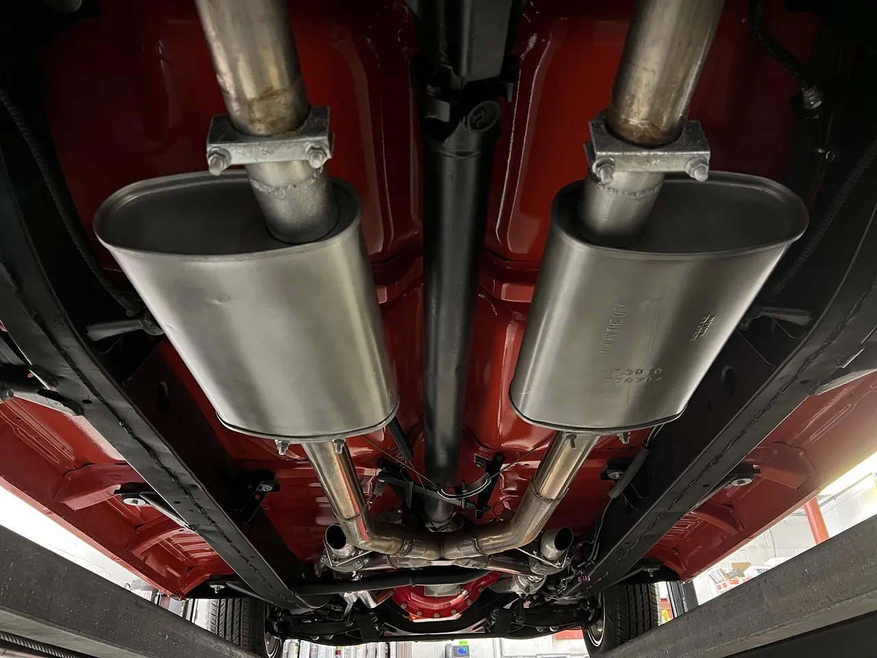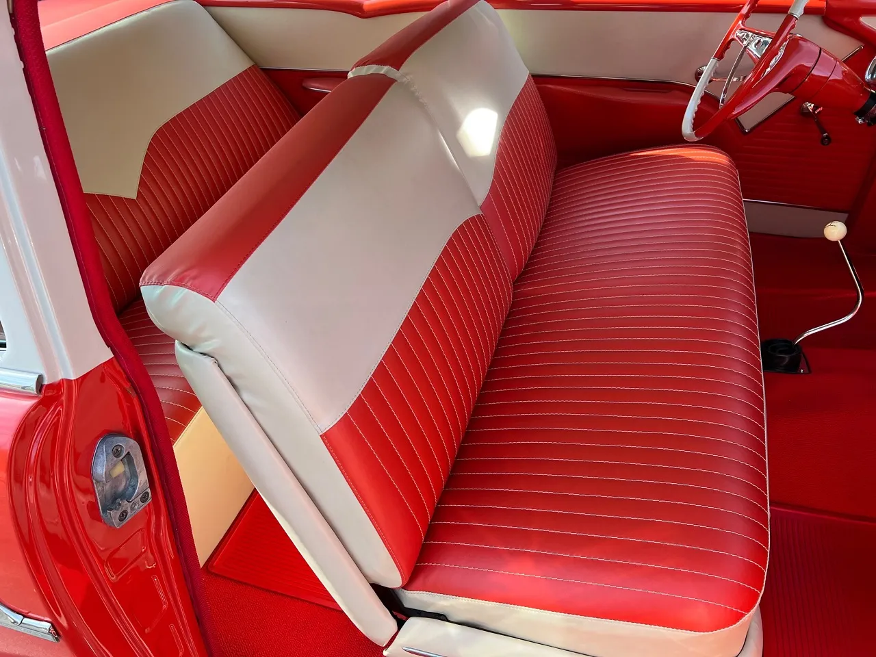 341 miles on Documented Frame Off Rotisserie Restoration, clean Alabama car, beautiful two tone Matador red & Adobe beige paint, two tone matching vinyl interior, 402 ci engine, 4 speed manual transmission, 4 bbl, factory intake manifolds, ceramic headers, power front disc brakes, Vintage air conditioning, factory bench seat, factory dash, Sun Pro tach & gauges, Retrosounds radio, stainless X pipe dual exhaust with electric cut-outs, factory rear end with 3.23 limited slip gear & POL traction bars, 275/40ZR20 rear tires, 235/40ZR18 fronts, 18 & 20” American Racing Torque Thrust II wheels, Collector Quality!