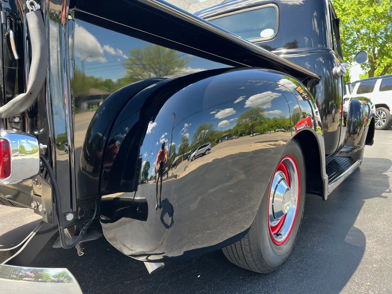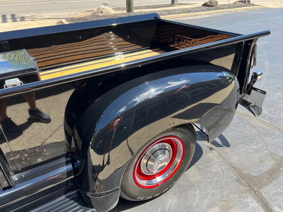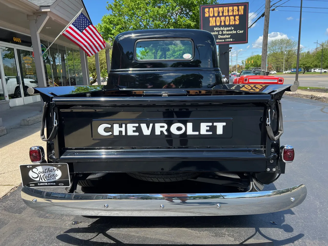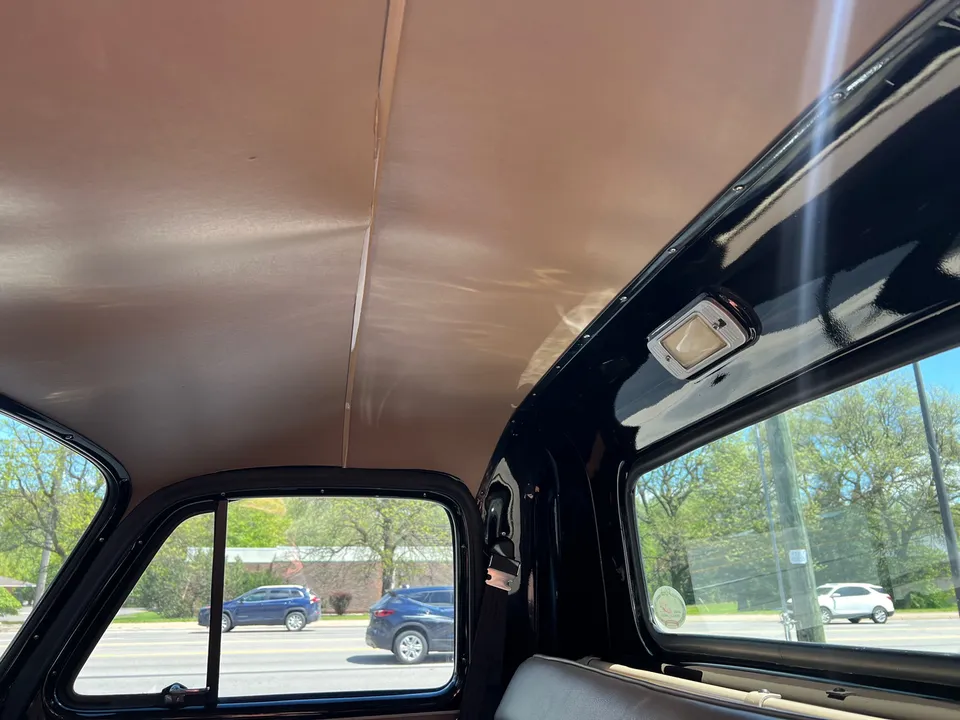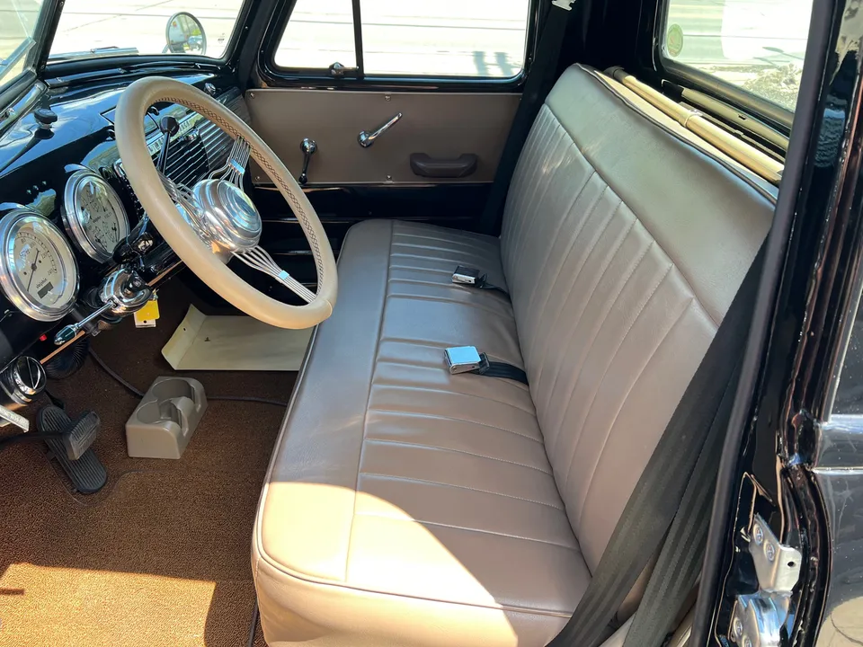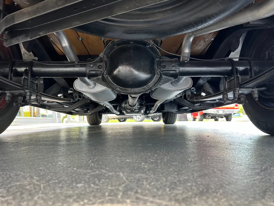1700 miles on Frame-Off Restored All Steel truck, beautiful Tuxedo black paint, Tan vinyl interior, 350 ci engine, 4 bbl, factory intake & exhaust manifolds, finned aluminum valve covers & air cleaner, HEI distributor, Fat Man Mustang II front suspension with power rack & pinion steering, front disc brakes, Vintage air conditioning, aluminum radiator with shroud, 700R4 automatic overdrive transmission, bench seat, Banjo steering wheel, Dolphin gauges, dual exhaust, GM 10 bolt rear end, wood bed, 215/75R15 tires, 15” Steel with caps & rings, electric wipers, dual mirrors, Ready to Cruise!