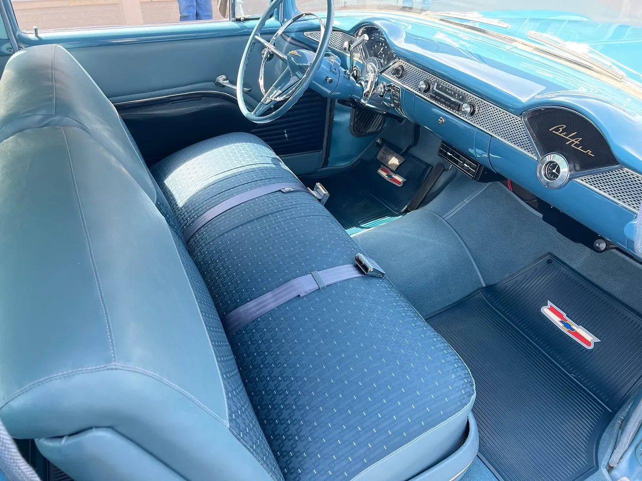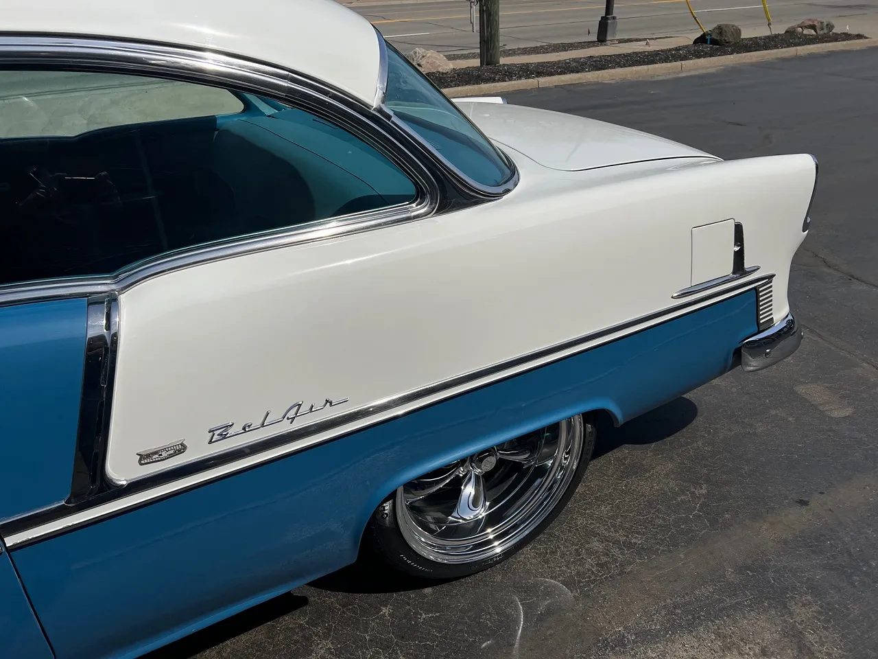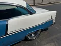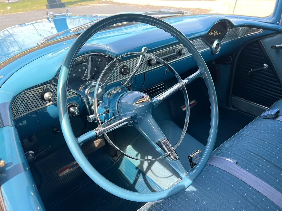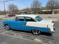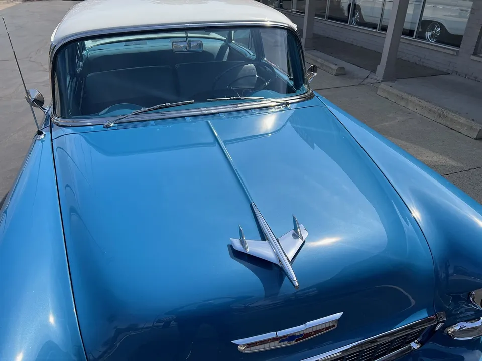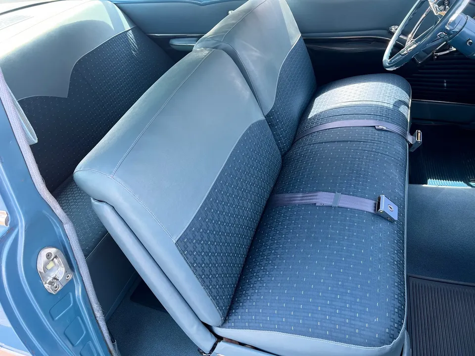 1300 miles on Body-Up Restoration, clean Arkansas car, beautiful two-tone Glacier blue & India Ivory, factory two tone blue interior, 350 ci engine, Holley 4 bbl, Edelbrock Performer Air Gap aluminum intake, HEI distributor, finned aluminum air cleaner & valve covers, aftermarket power steering, tubular upper & lower control arms, power front disc brakes, air conditioning, 700R4 automatic overdrive transmission, factory bench seat, tilt column with Bel Air wheel, Classic Instruments gauge cluster, am radio, Flowmaster dual exhaust, factory rear end, 275/35ZR20 rear tires, 225/40ZR18 fronts, 18 & 20” chrome American Torque Thrust II wheels, factory jack with spare, EZ-Eye glass, Ready to Cruise!IN STOCK