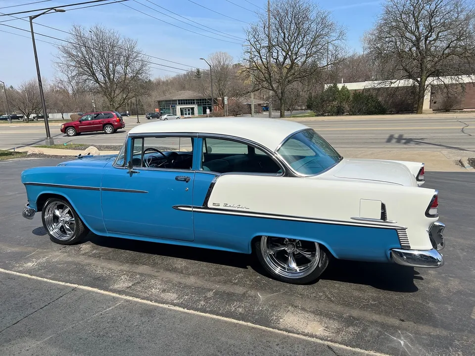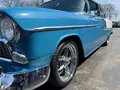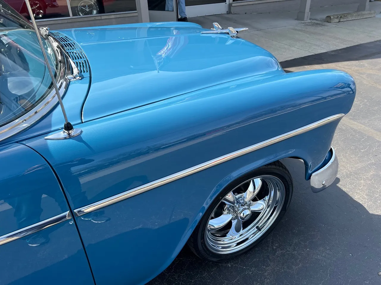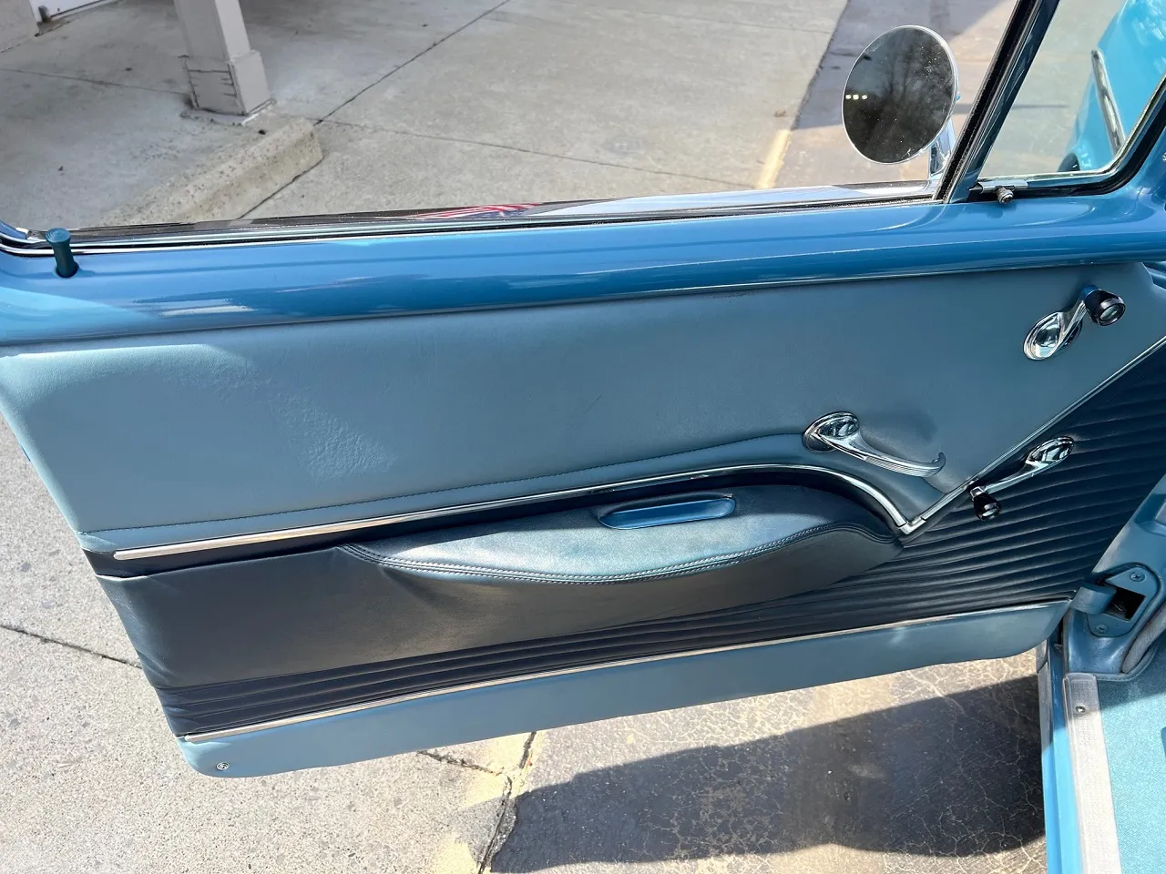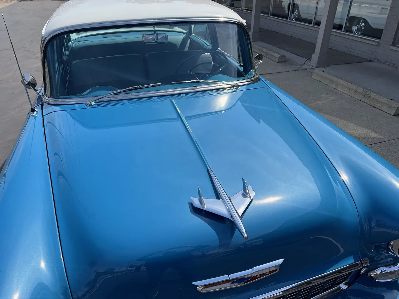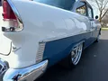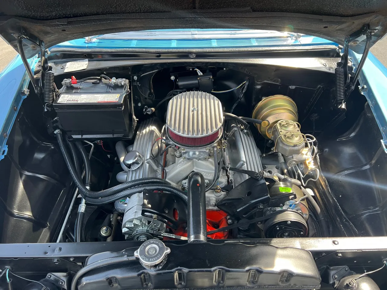 1300 miles on Body-Up Restoration, clean Arkansas car, beautiful two-tone Glacier blue & India Ivory, factory two tone blue interior, 350 ci engine, Holley 4 bbl, Edelbrock Performer Air Gap aluminum intake, HEI distributor, finned aluminum air cleaner & valve covers, aftermarket power steering, tubular upper & lower control arms, power front disc brakes, air conditioning, 700R4 automatic overdrive transmission, factory bench seat, tilt column with Bel Air wheel, Classic Instruments gauge cluster, am radio, Flowmaster dual exhaust, factory rear end, 275/35ZR20 rear tires, 225/40ZR18 fronts, 18 & 20” chrome American Torque Thrust II wheels, factory jack with spare, EZ-Eye glass, Ready to Cruise!IN STOCK