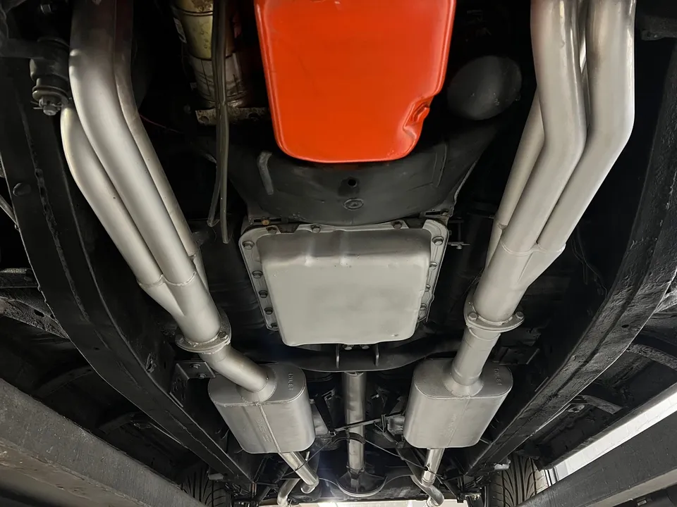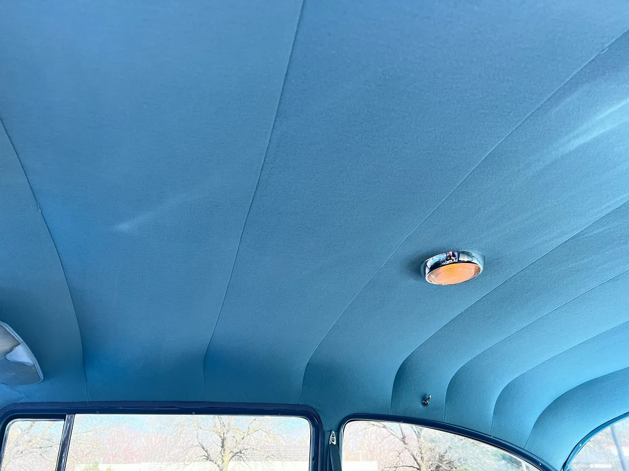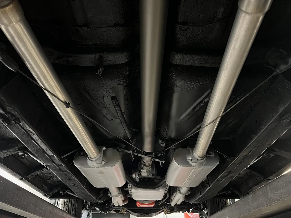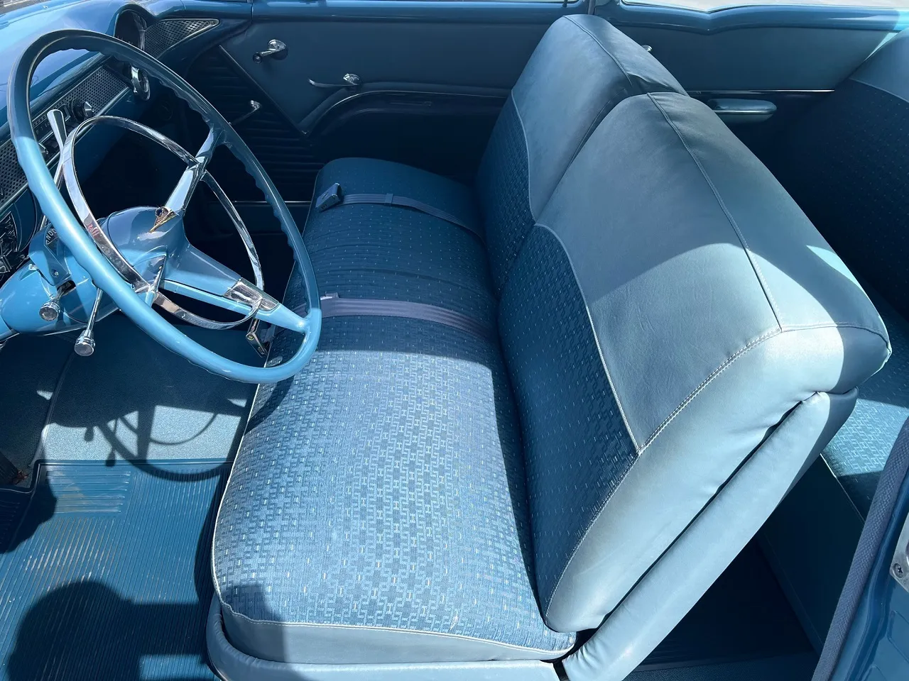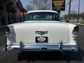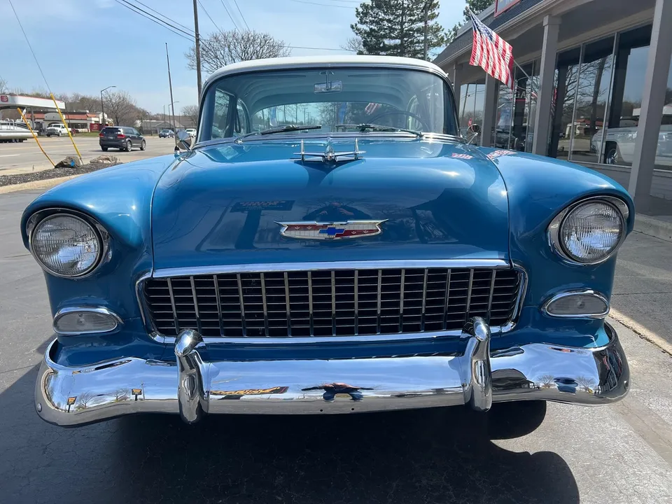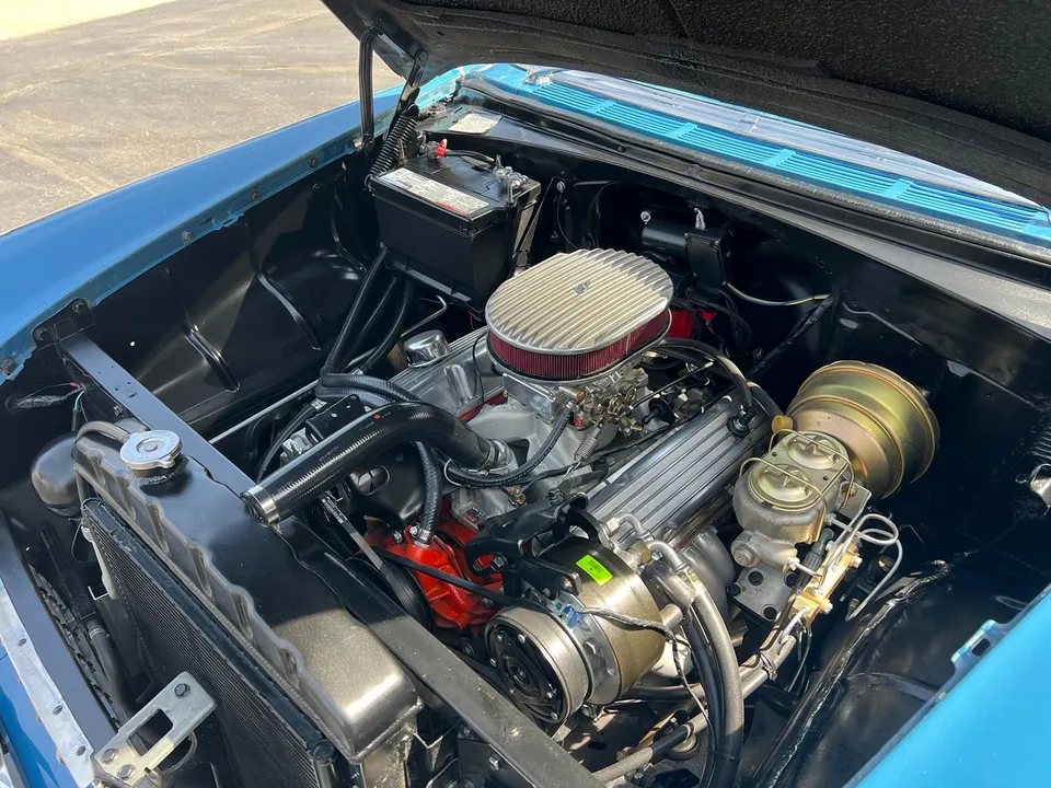 1300 miles on Body-Up Restoration, clean Arkansas car, beautiful two-tone Glacier blue & India Ivory, factory two tone blue interior, 350 ci engine, Holley 4 bbl, Edelbrock Performer Air Gap aluminum intake, HEI distributor, finned aluminum air cleaner & valve covers, aftermarket power steering, tubular upper & lower control arms, power front disc brakes, air conditioning, 700R4 automatic overdrive transmission, factory bench seat, tilt column with Bel Air wheel, Classic Instruments gauge cluster, am radio, Flowmaster dual exhaust, factory rear end, 275/35ZR20 rear tires, 225/40ZR18 fronts, 18 & 20” chrome American Torque Thrust II wheels, factory jack with spare, EZ-Eye glass, Ready to Cruise!IN STOCK