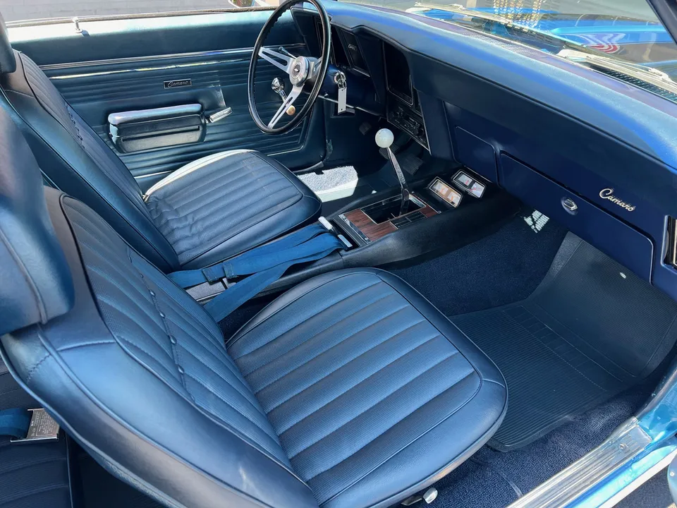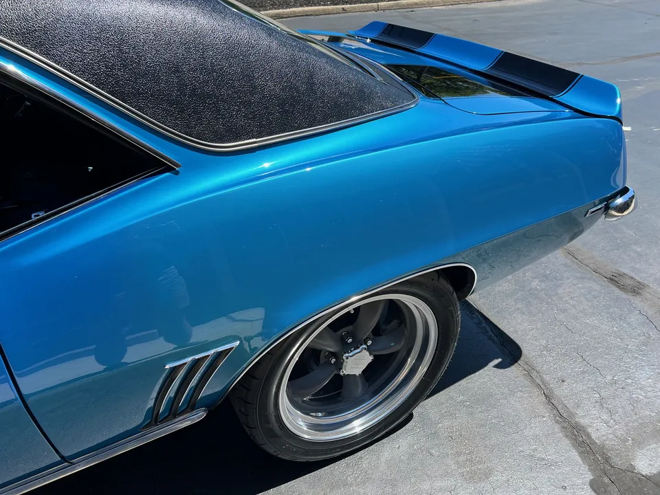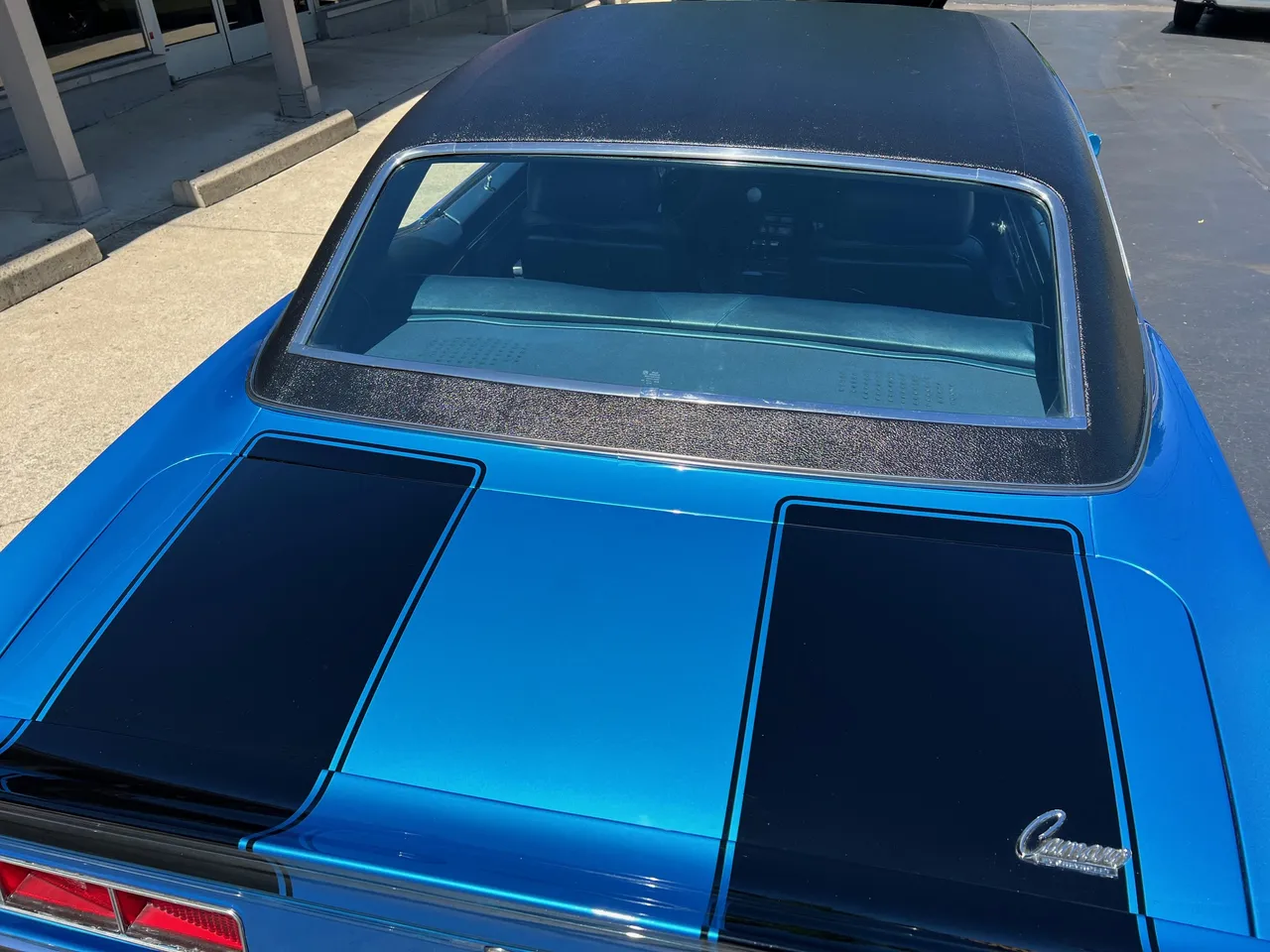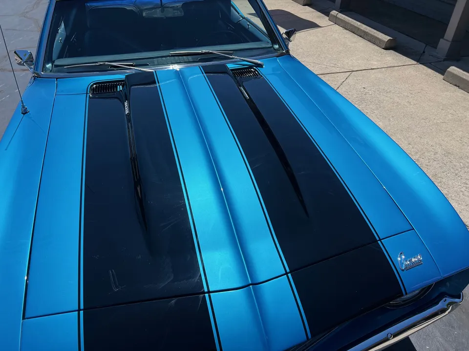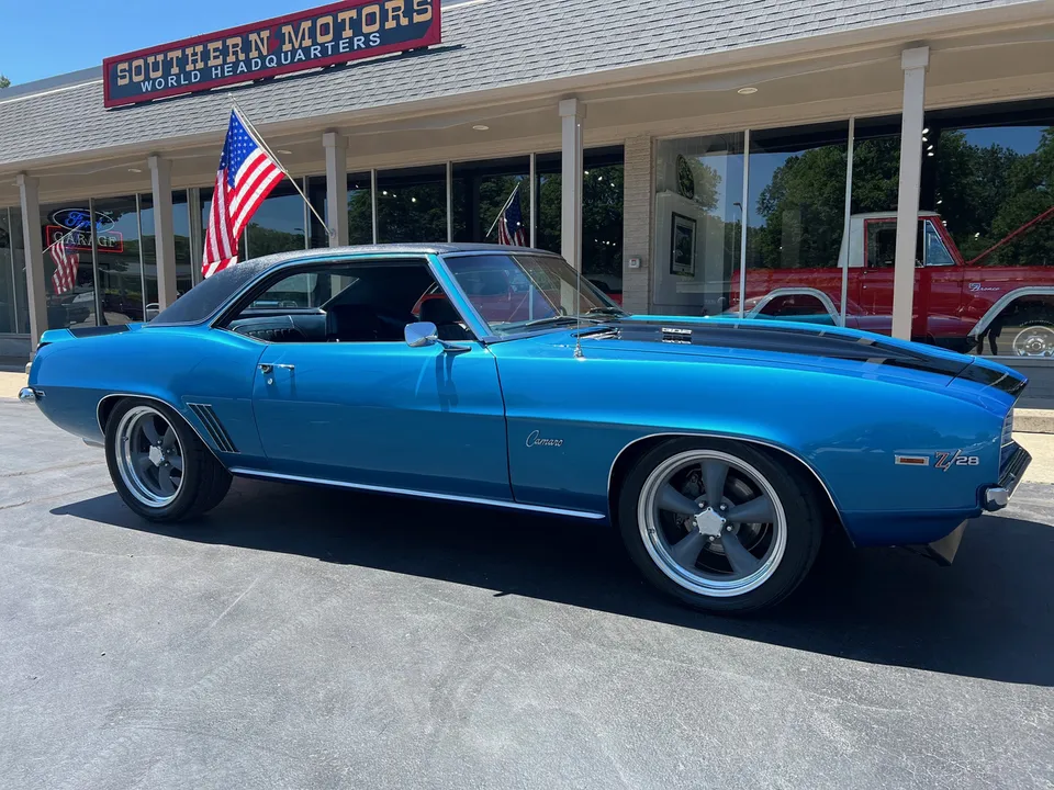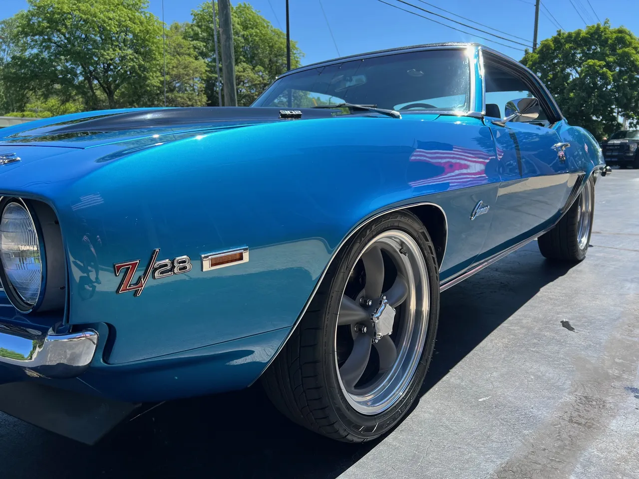 Clean Georgia car, Recent Body-Up Restoration, Z28 tribute car, beautiful LeMans blue metallic paint, black Z28 striping, black vinyl top, blue vinyl interior, 69’ date coded 350 ci engine, Muncie 4 speed manual transmission, Holley dual feed 4 bbl, Edelbrock aluminum intake, mild camshaft, GM “double hump” heads, coated headers, Mallory HEI distributor, cowl induction air cleaner, finned aluminum valve covers, power steering, power front disc brakes, factory bucket seats with center console, Sport steering wheel, factory tach & gauges, Hurst shifter, H-pipe Flowmaster dual exhaust, factory 12 bolt 3.55 limited slip rear axle, 255/45ZR18 Nitto rear tires, 225/45ZR18 fronts, 18” American Racing Torque Thrust wheels with Salt Flat caps, front & rear spoilers, cowl hood, Drive Anywhere!