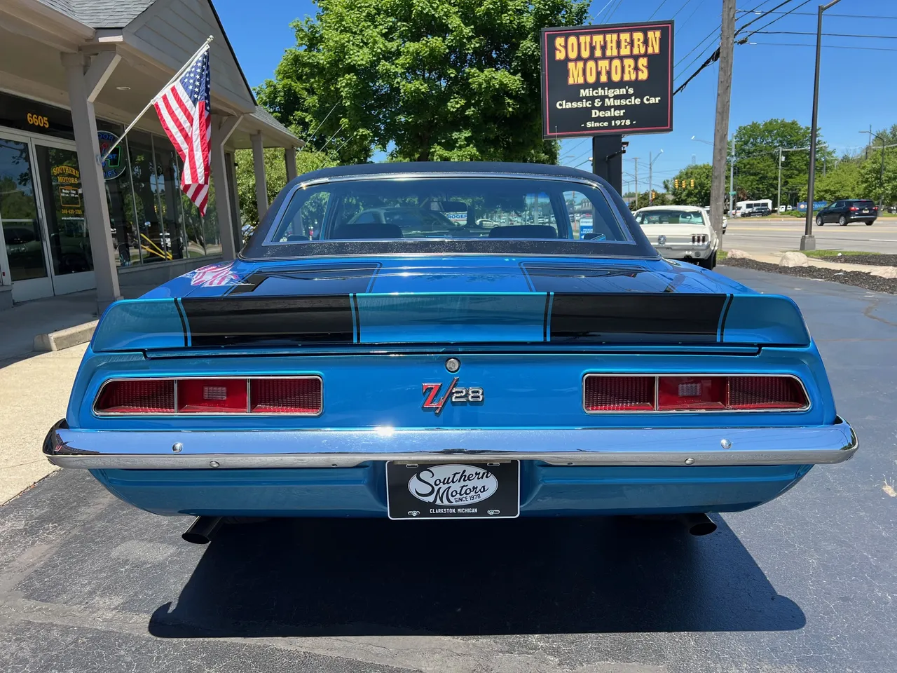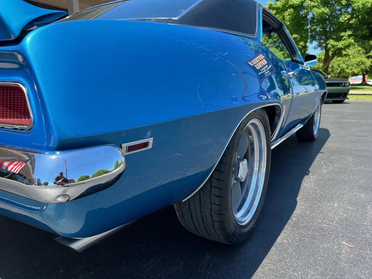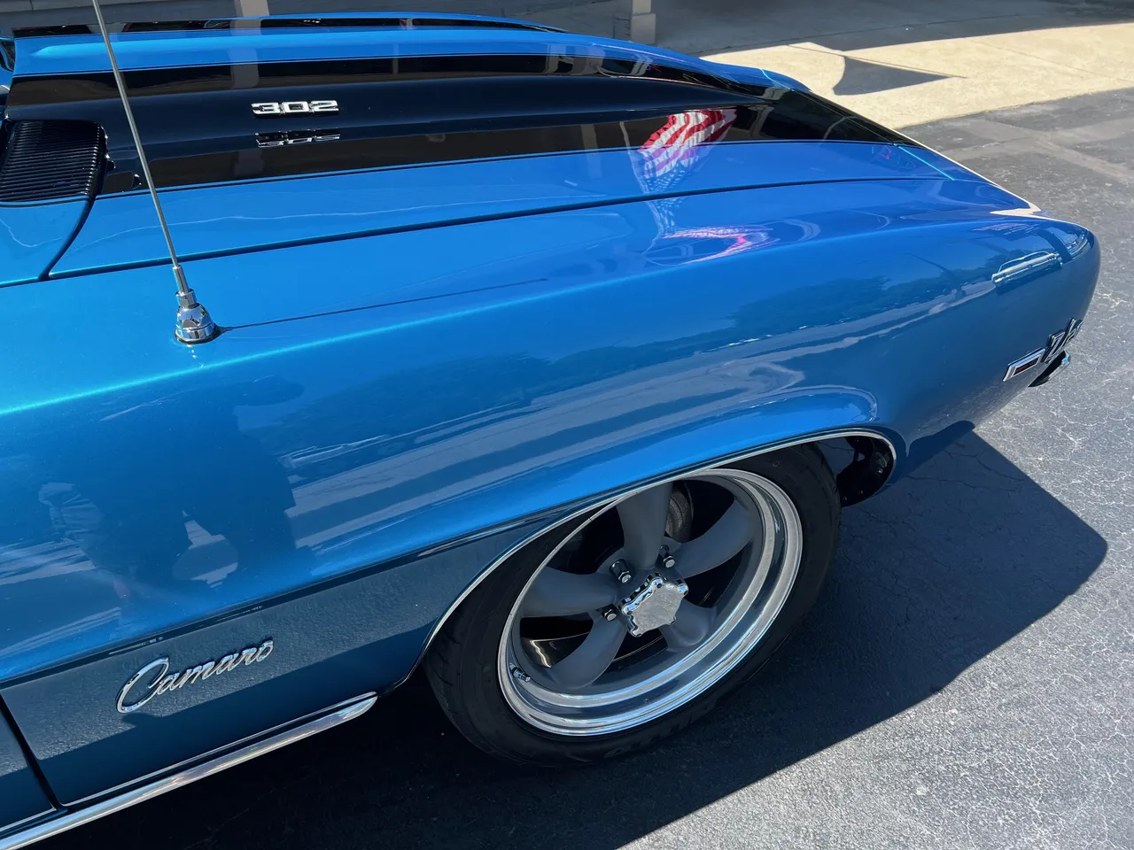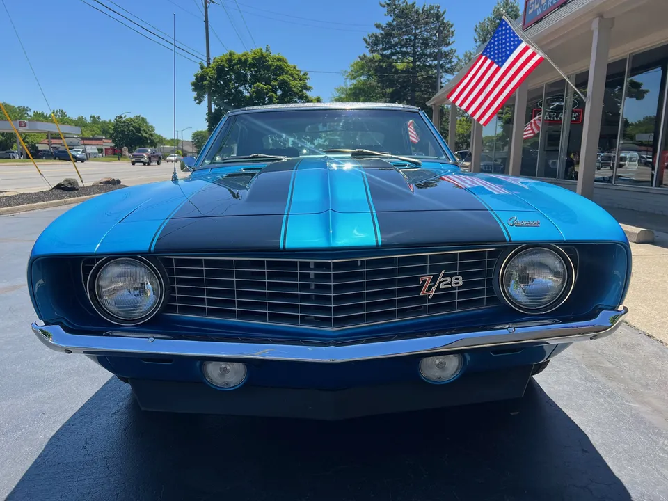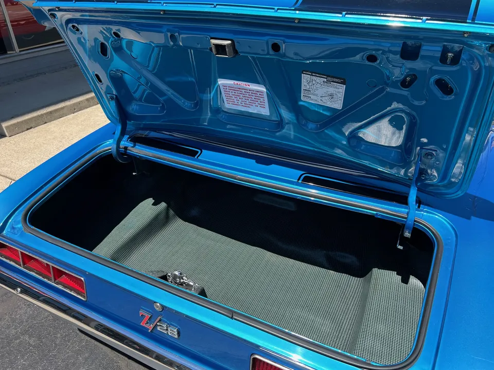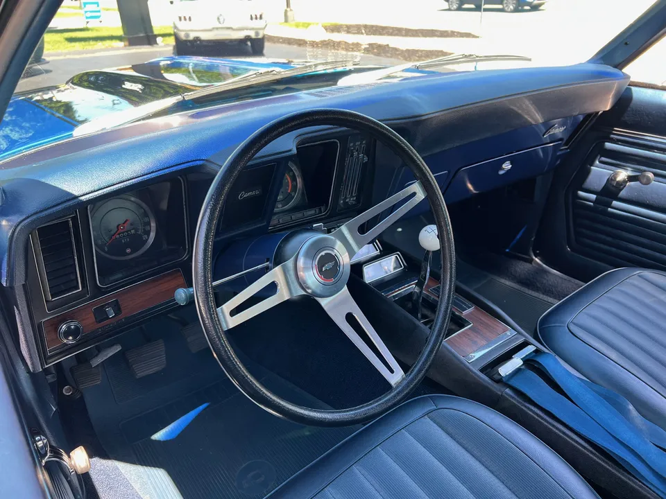 Clean Georgia car, Recent Body-Up Restoration, Z28 tribute car, beautiful LeMans blue metallic paint, black Z28 striping, black vinyl top, blue vinyl interior, 69’ date coded 350 ci engine, Muncie 4 speed manual transmission, Holley dual feed 4 bbl, Edelbrock aluminum intake, mild camshaft, GM “double hump” heads, coated headers, Mallory HEI distributor, cowl induction air cleaner, finned aluminum valve covers, power steering, power front disc brakes, factory bucket seats with center console, Sport steering wheel, factory tach & gauges, Hurst shifter, H-pipe Flowmaster dual exhaust, factory 12 bolt 3.55 limited slip rear axle, 255/45ZR18 Nitto rear tires, 225/45ZR18 fronts, 18” American Racing Torque Thrust wheels with Salt Flat caps, front & rear spoilers, cowl hood, Drive Anywhere!