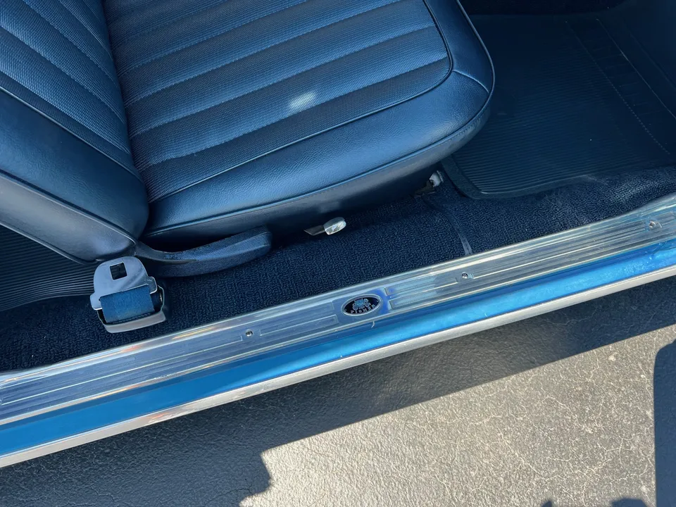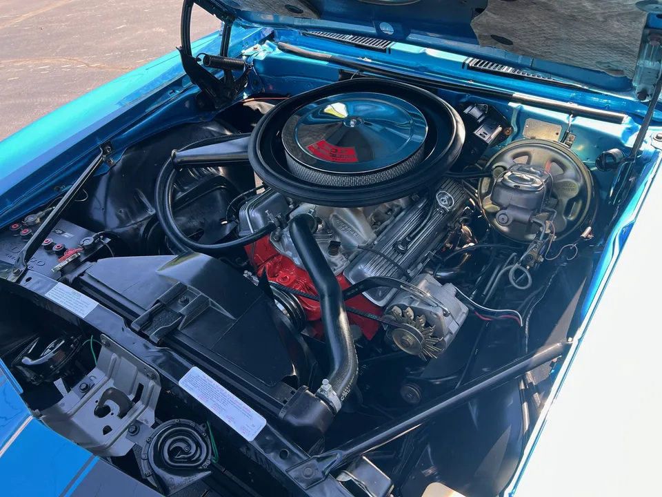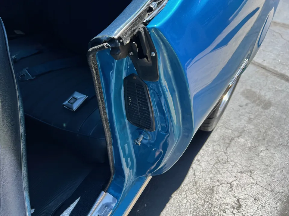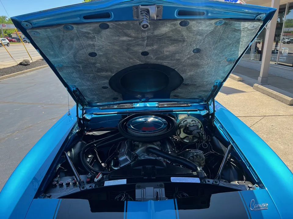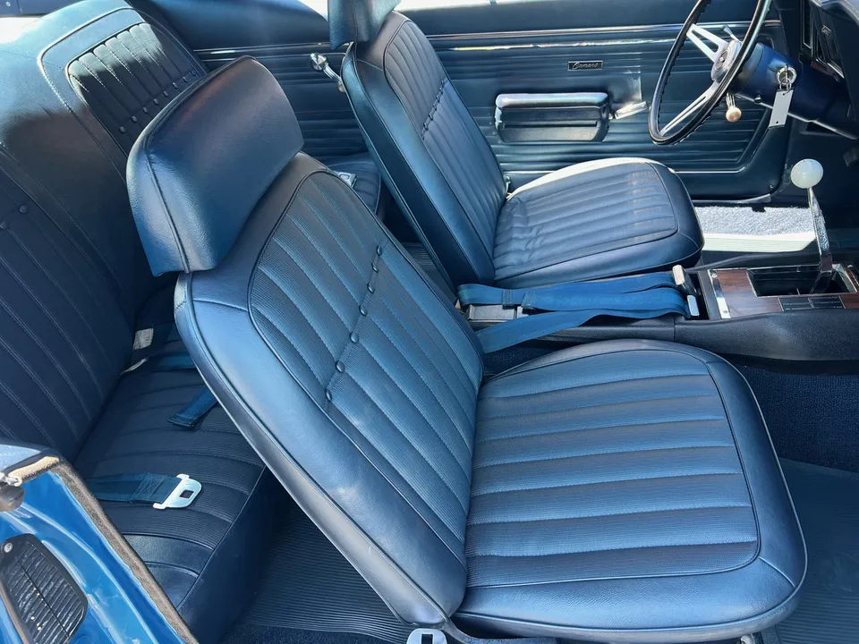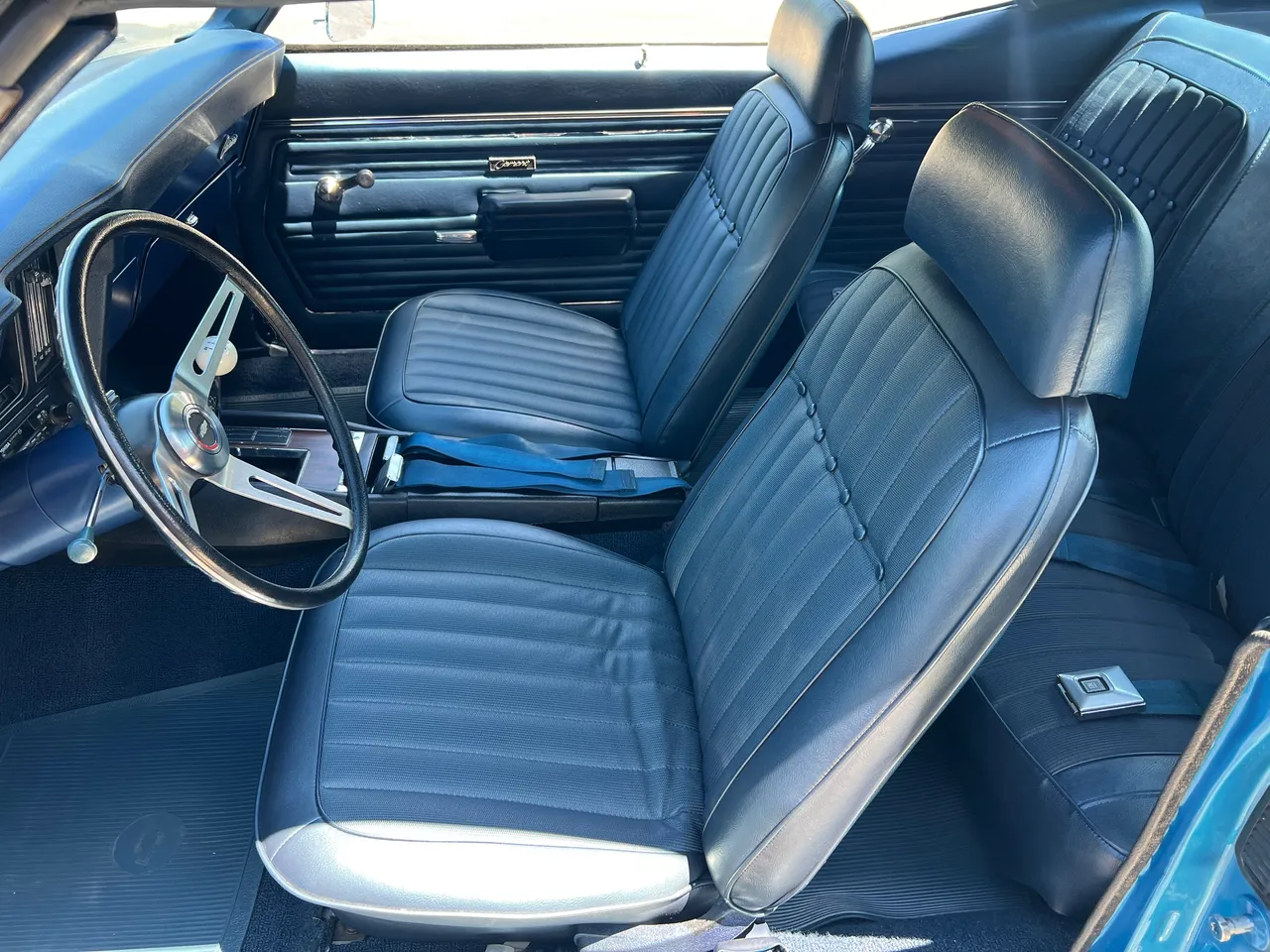 Clean Georgia car, Recent Body-Up Restoration, Z28 tribute car, beautiful LeMans blue metallic paint, black Z28 striping, black vinyl top, blue vinyl interior, 69’ date coded 350 ci engine, Muncie 4 speed manual transmission, Holley dual feed 4 bbl, Edelbrock aluminum intake, mild camshaft, GM “double hump” heads, coated headers, Mallory HEI distributor, cowl induction air cleaner, finned aluminum valve covers, power steering, power front disc brakes, factory bucket seats with center console, Sport steering wheel, factory tach & gauges, Hurst shifter, H-pipe Flowmaster dual exhaust, factory 12 bolt 3.55 limited slip rear axle, 255/45ZR18 Nitto rear tires, 225/45ZR18 fronts, 18” American Racing Torque Thrust wheels with Salt Flat caps, front & rear spoilers, cowl hood, Drive Anywhere!