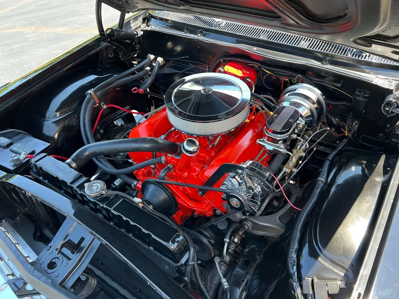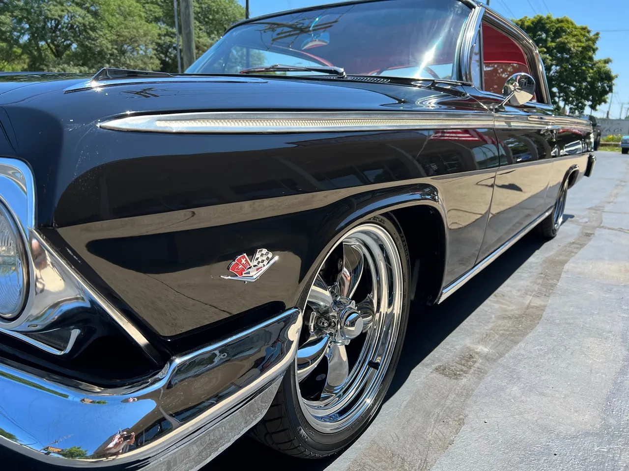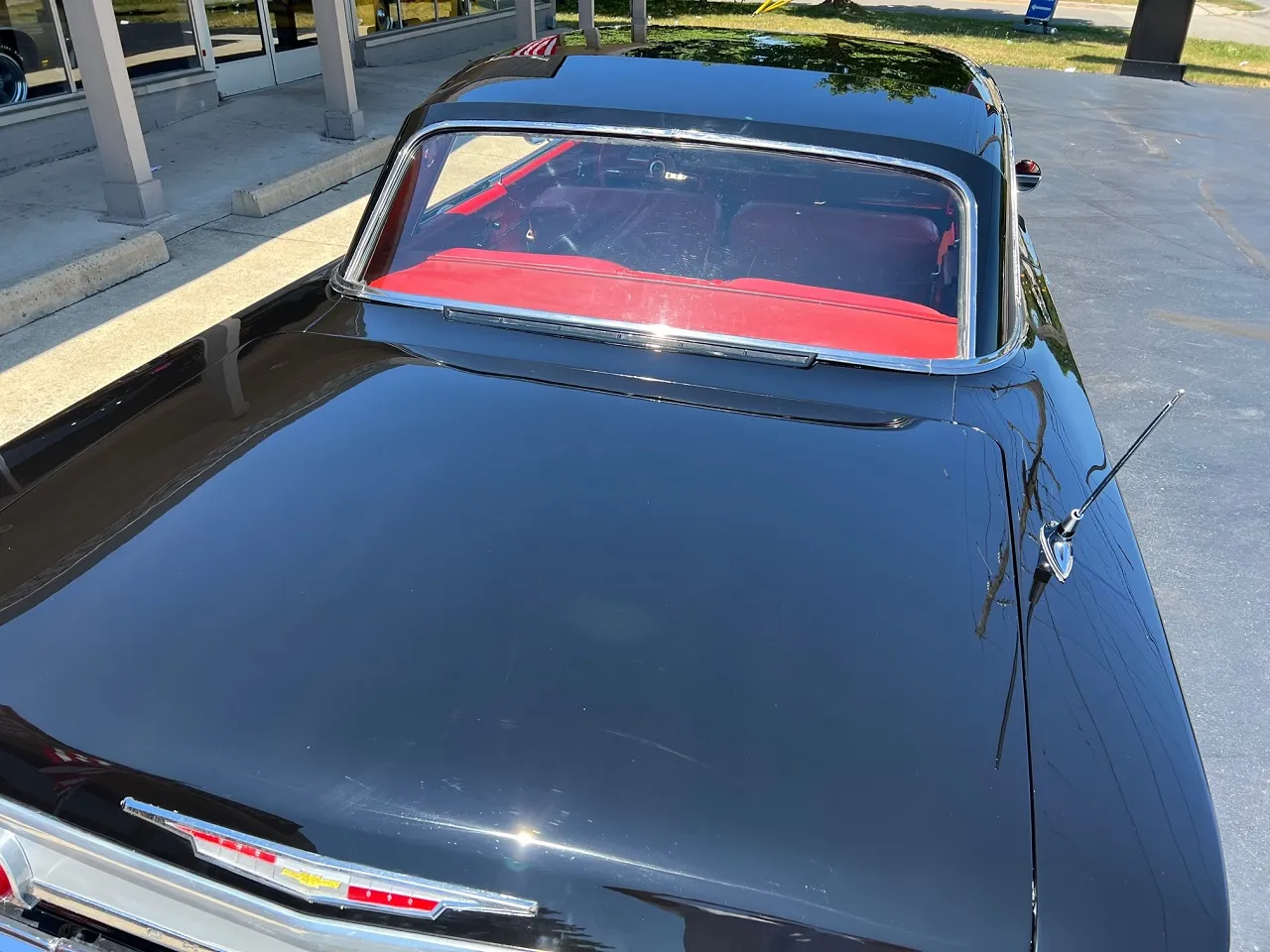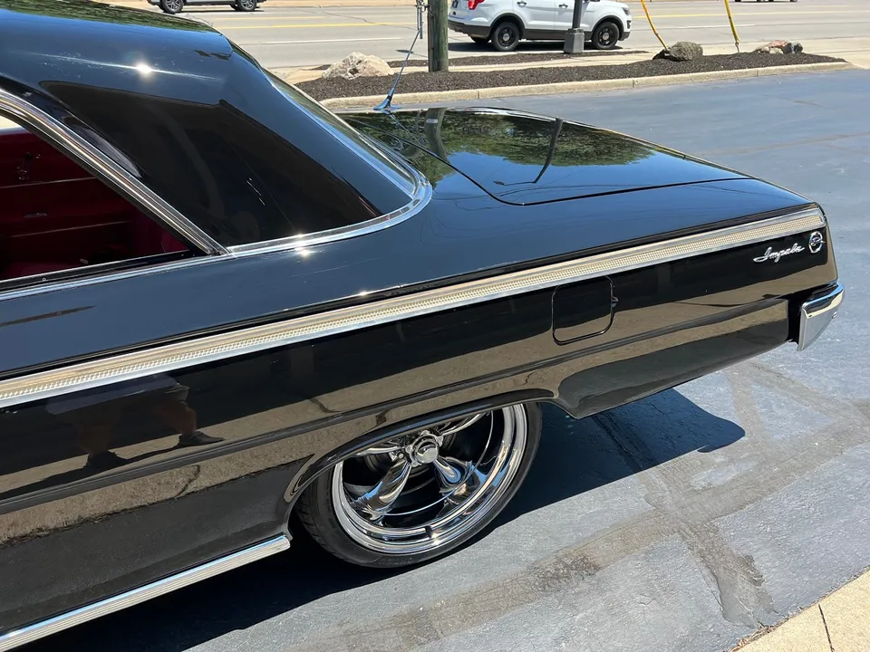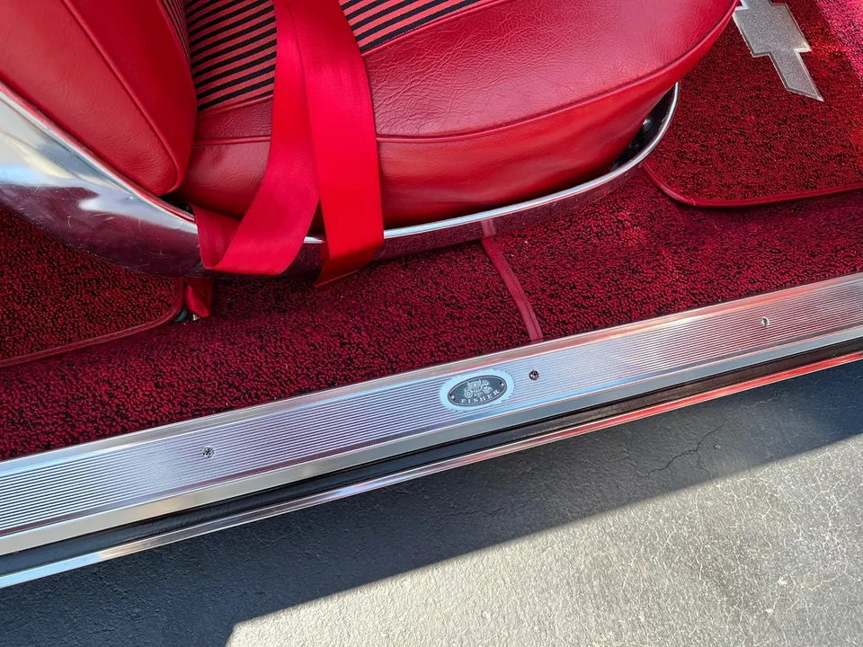 Clean Virginia car, Recent Body-Up Restoration, factory (900) Tuxedo black, factory (874) red interior, 348 ci engine, Holley Performance 4 bbl, factory intake & exhaust manifolds, chrome air cleaner, HEI distributor, power steering, power front disc brakes with slotted & drilled rotors, aluminum radiator with electric fan, 700R4 automatic overdrive transmission, factory bench seat, factory dash, Sun Pro gauges, am radio, dual exhaust, factory rear with 3.50 gear, 275/35ZR20 rear tires, 225/40ZR18 fronts, 18 & 20” American Racing Torque Thrust II wheels, dual chrome mirrors, lowered 2”, Ready to Cruise!