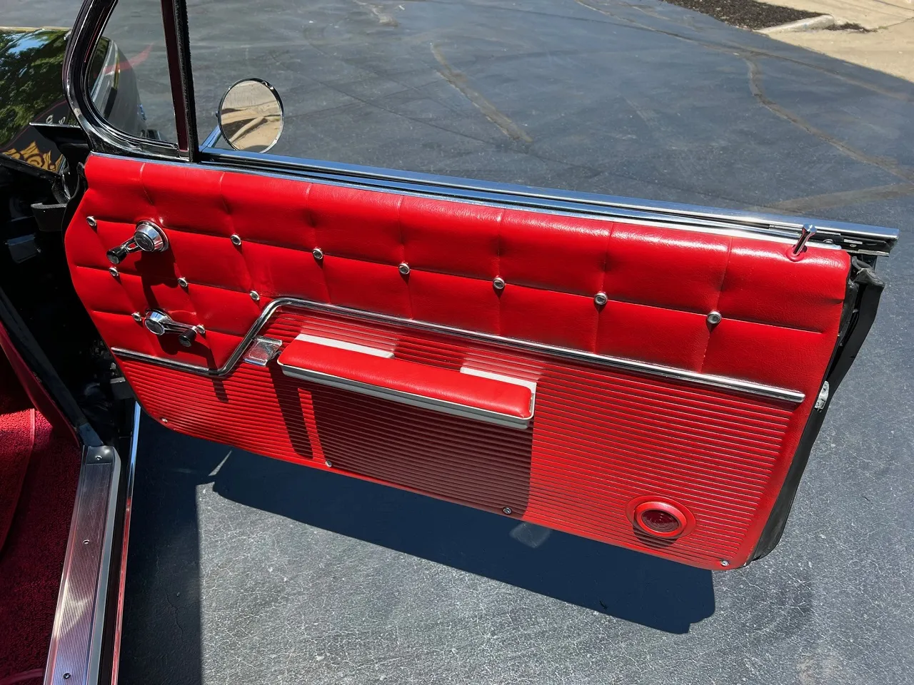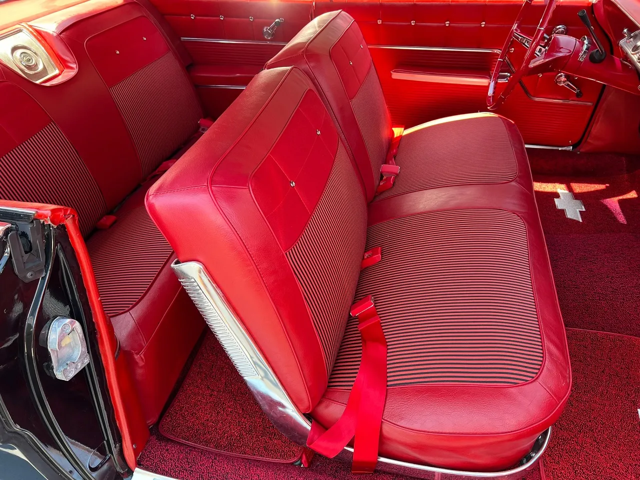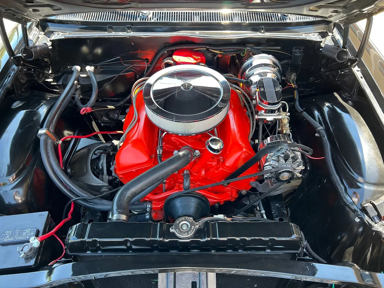 Clean Virginia car, Recent Body-Up Restoration, factory (900) Tuxedo black, factory (874) red interior, 348 ci engine, Holley Performance 4 bbl, factory intake & exhaust manifolds, chrome air cleaner, HEI distributor, power steering, power front disc brakes with slotted & drilled rotors, aluminum radiator with electric fan, 700R4 automatic overdrive transmission, factory bench seat, factory dash, Sun Pro gauges, am radio, dual exhaust, factory rear with 3.50 gear, 275/35ZR20 rear tires, 225/40ZR18 fronts, 18 & 20” American Racing Torque Thrust II wheels, dual chrome mirrors, lowered 2”, Ready to Cruise!