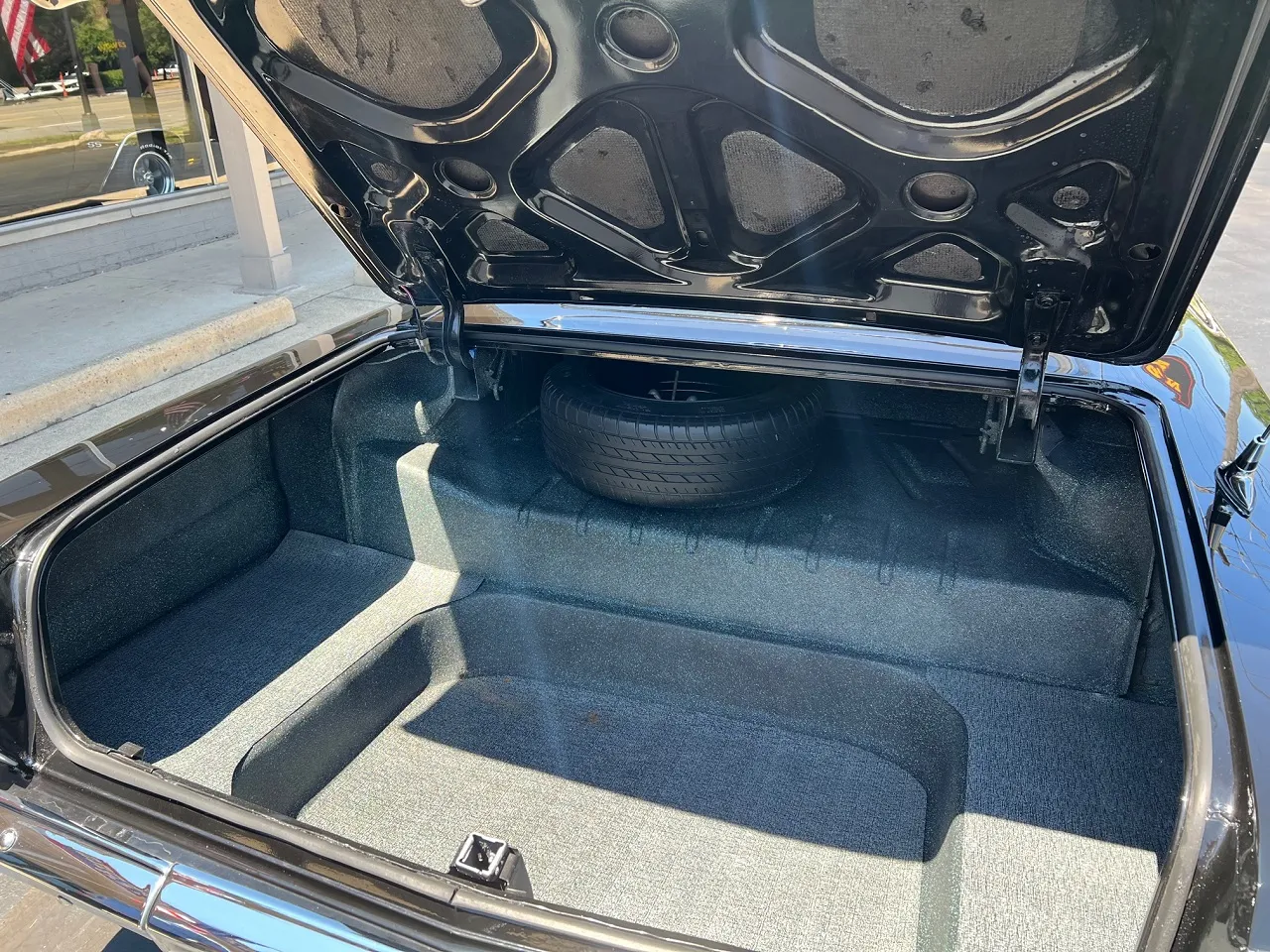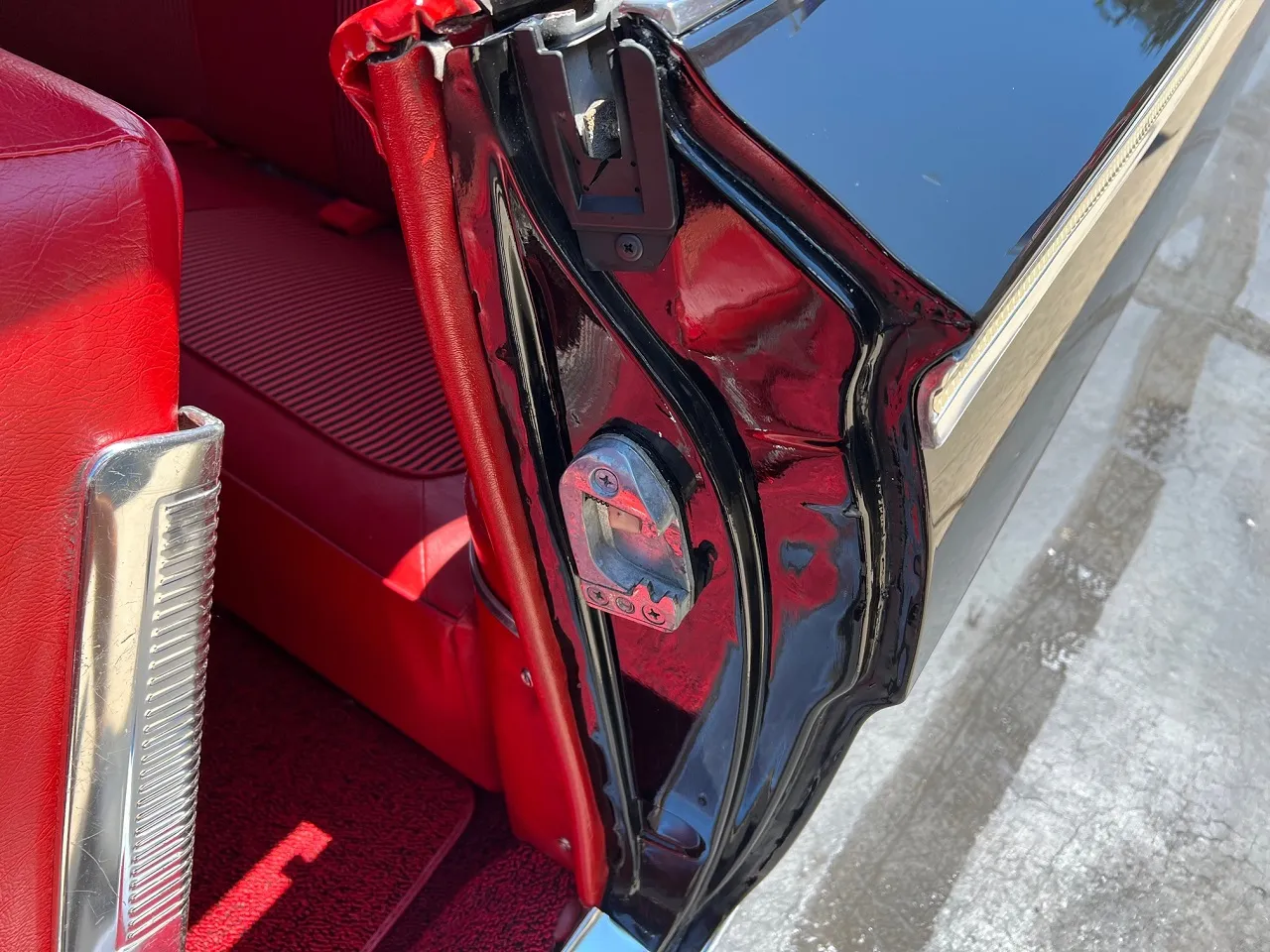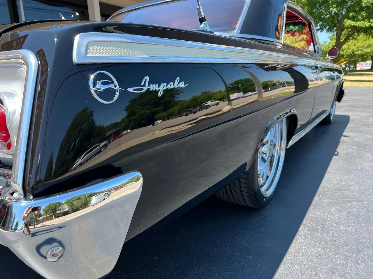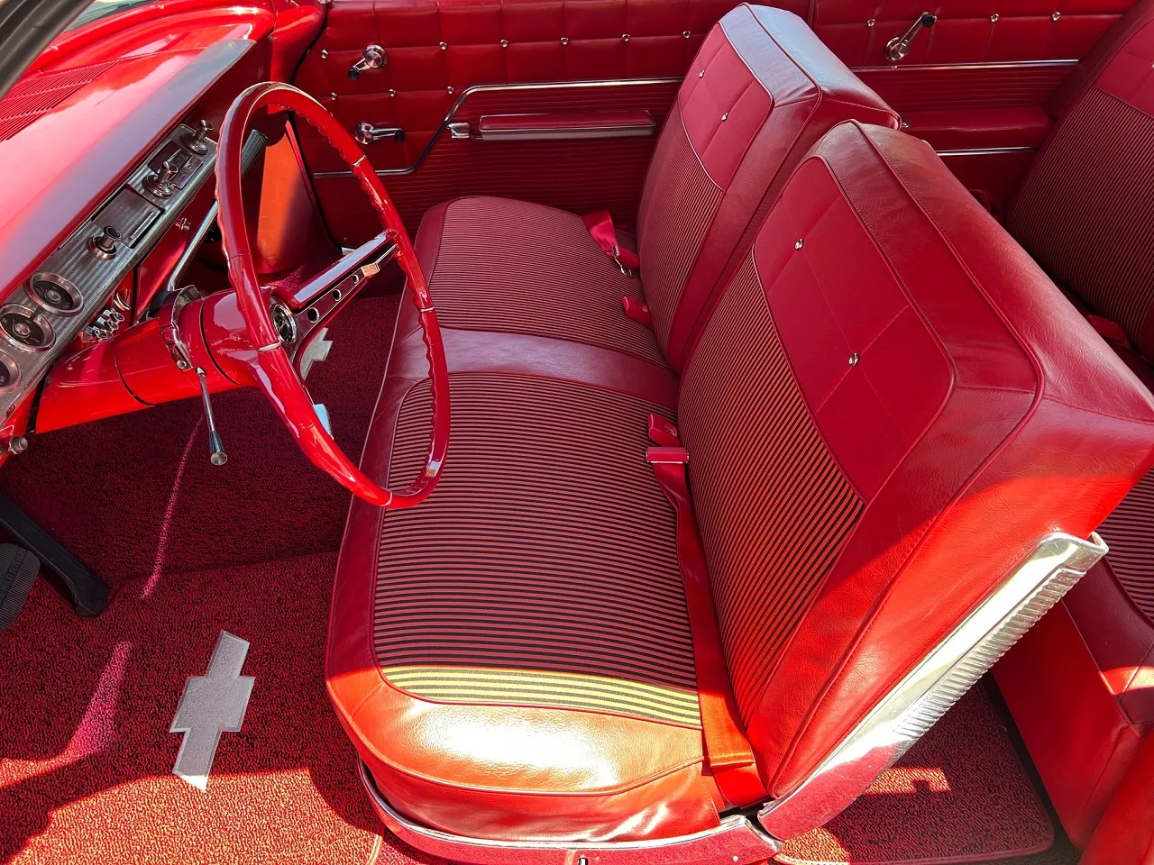 Clean Virginia car, Recent Body-Up Restoration, factory (900) Tuxedo black, factory (874) red interior, 348 ci engine, Holley Performance 4 bbl, factory intake & exhaust manifolds, chrome air cleaner, HEI distributor, power steering, power front disc brakes with slotted & drilled rotors, aluminum radiator with electric fan, 700R4 automatic overdrive transmission, factory bench seat, factory dash, Sun Pro gauges, am radio, dual exhaust, factory rear with 3.50 gear, 275/35ZR20 rear tires, 225/40ZR18 fronts, 18 & 20” American Racing Torque Thrust II wheels, dual chrome mirrors, lowered 2”, Ready to Cruise!