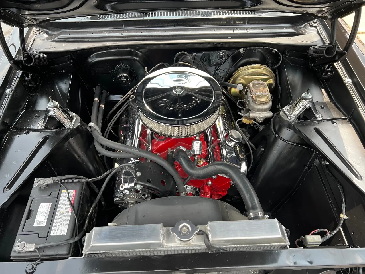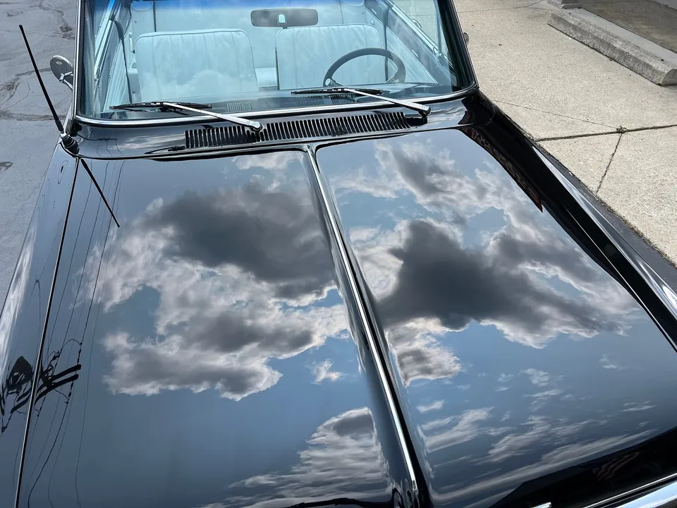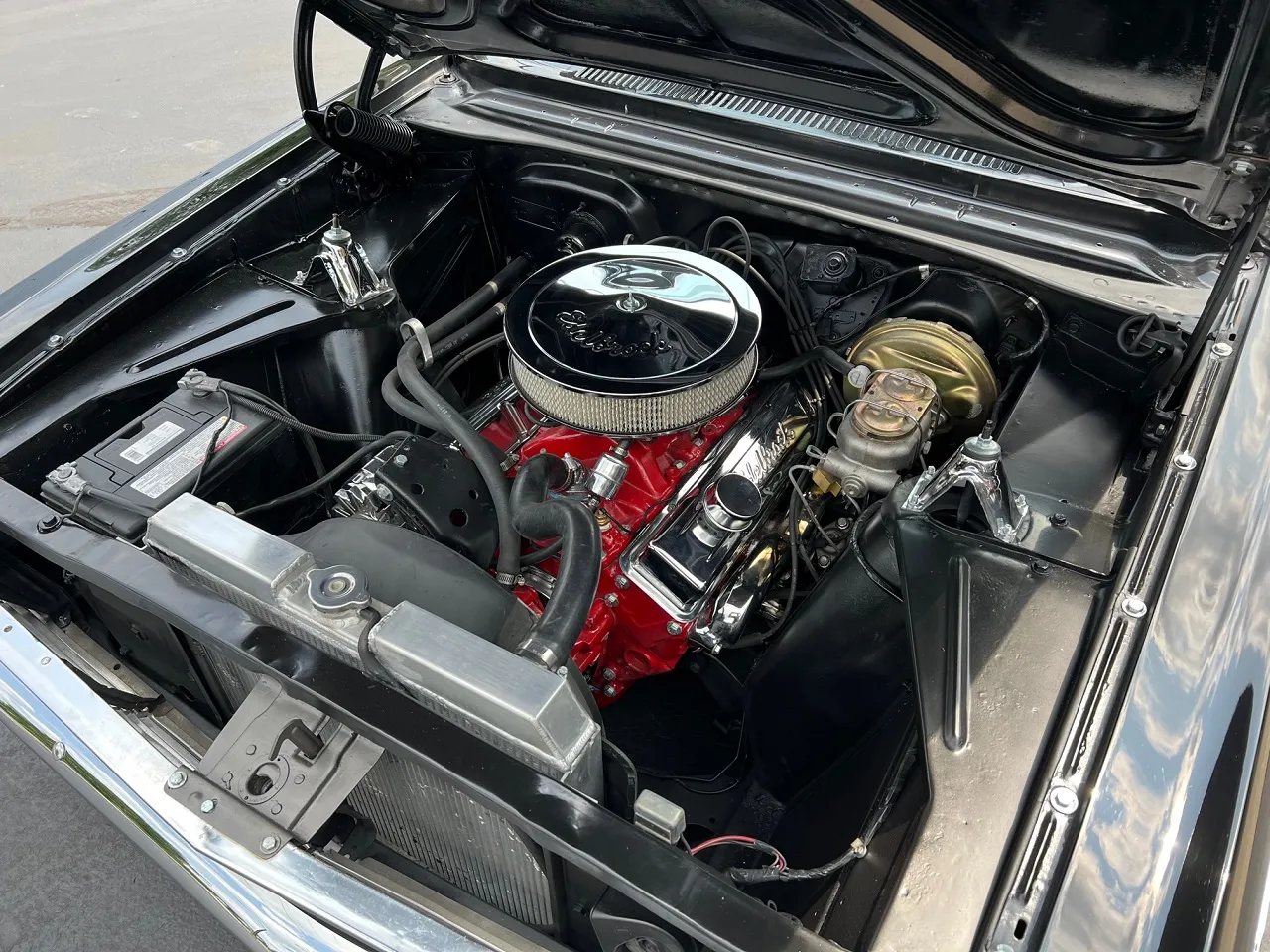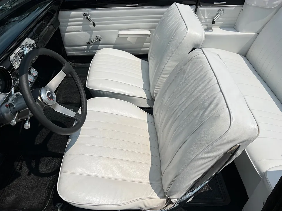 Clean Kentucky car, Body-Up Restoration, beautiful Tuxedo black paint, white vinyl interior, 350 ci engine, Holley Performance 4 bbl, Edelbrock aluminum intake, ceramic coated ram’s horn exhaust manifolds, Mallory Unilite distributor, chrome air cleaner & valve covers, power front disc brakes, aluminum radiator with shroud, 350 turbohydramatic transmission, bucket seats, stainless tilt column with custom reto-billet leather wrapped wheel, factory dash, aftermarket gauges, Retrosounds radio, new dual exhaust, factory 10 bolt rear end, 205/70R14 rear tires, 185/60R14 fronts, 14” American Racing Torque Thrust D wheels, dual chrome mirrors, original owner’s manual, Ready to Cruise!IN STOCK